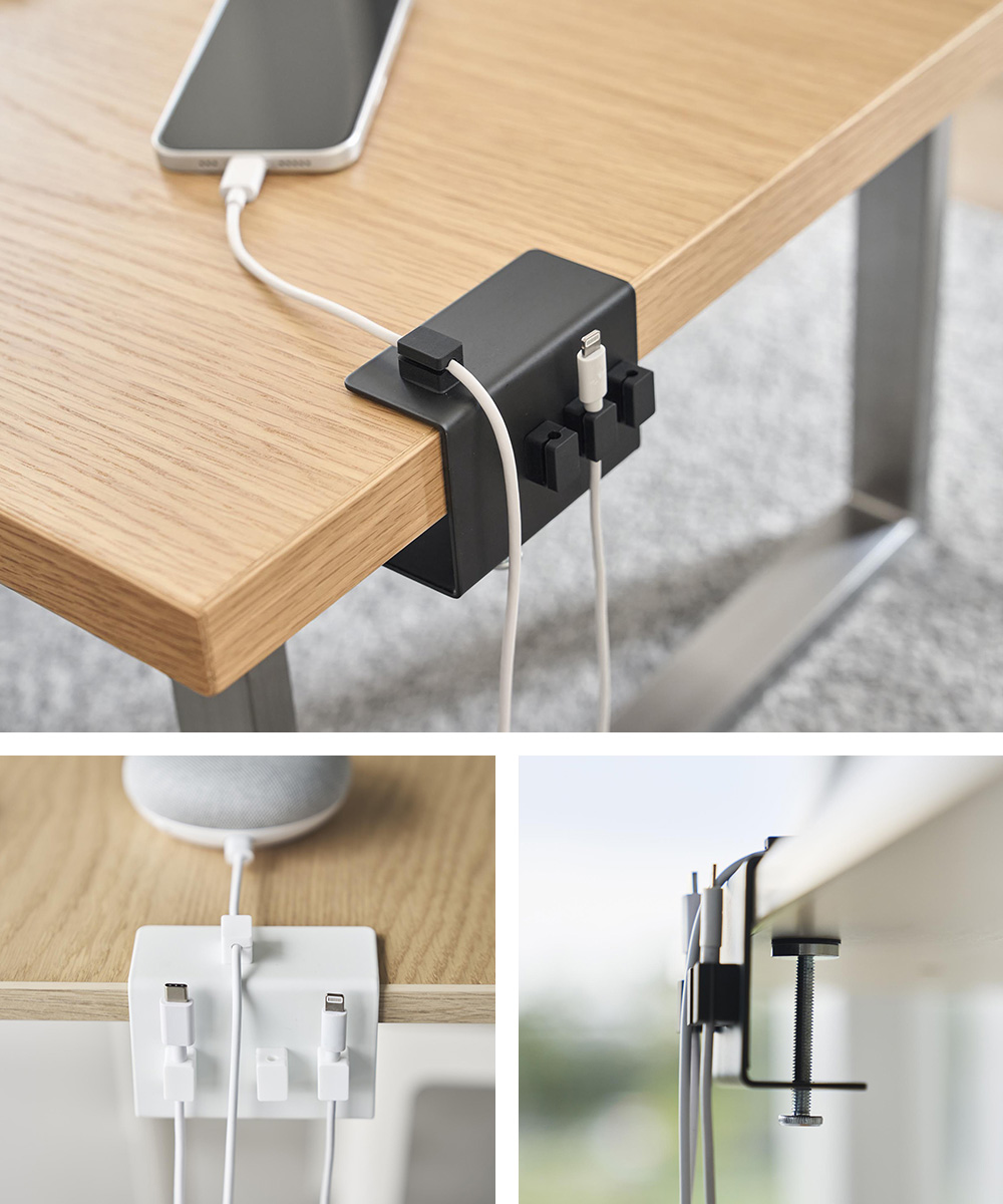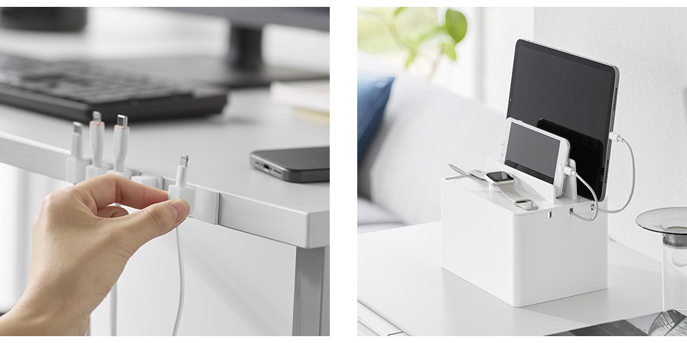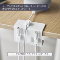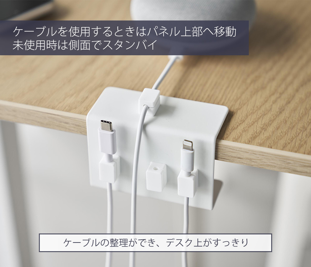 ケーブルホルダーは本体のスチールパネルの上部・側面どちらにも取り付けができます。充電などでケーブルを使用するときにはパネル上部で移動、未使用時は側面でスタンバイさせておくと、ケーブルの整理もできでデスク上がすっきりします。