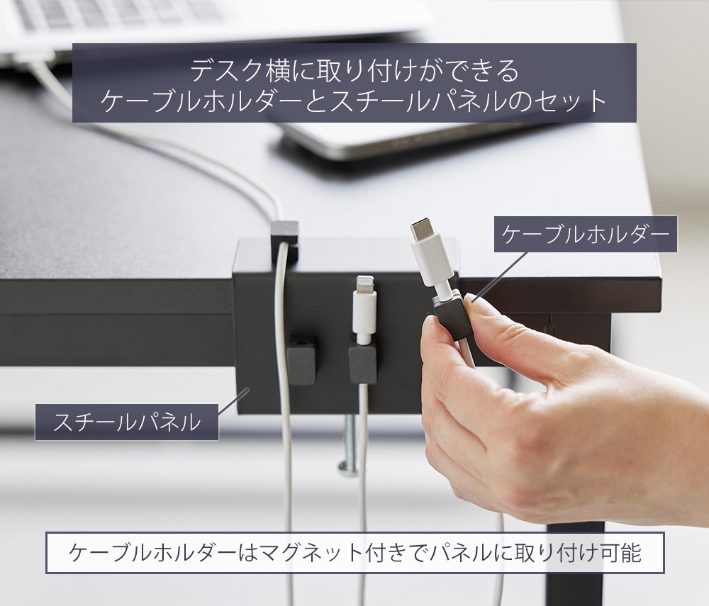 デスクやテーブル天板のすぐ横に取り付けが可能な、ケーブルホルダーとスチールパネルのセットです。ケーブルホルダーにはマグネットが内蔵されていてパネルにさっと取り付けができます。