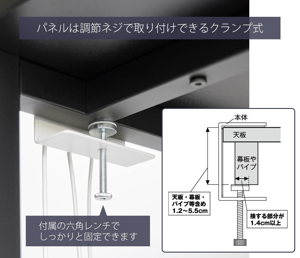 スチールパネル(本体)は調節ネジで天板に取り付けができるクランプ式です。付属の六角レンチでしっかりと固定ができます。
