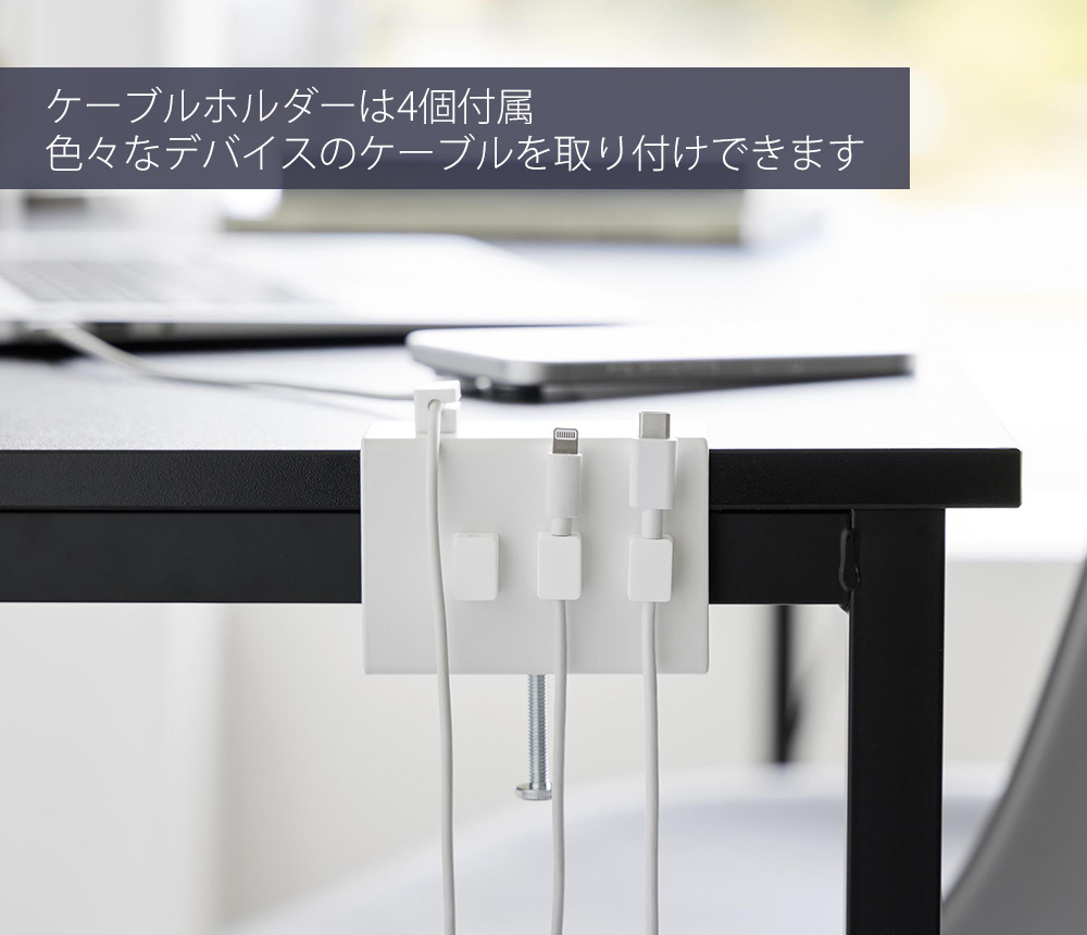 ケーブルホルダーは4個付属します。USB Type-CやLightning、Micro USB Type-Bなどデバイスによって種類が違うケーブル類をまとめて取り付けが可能です。