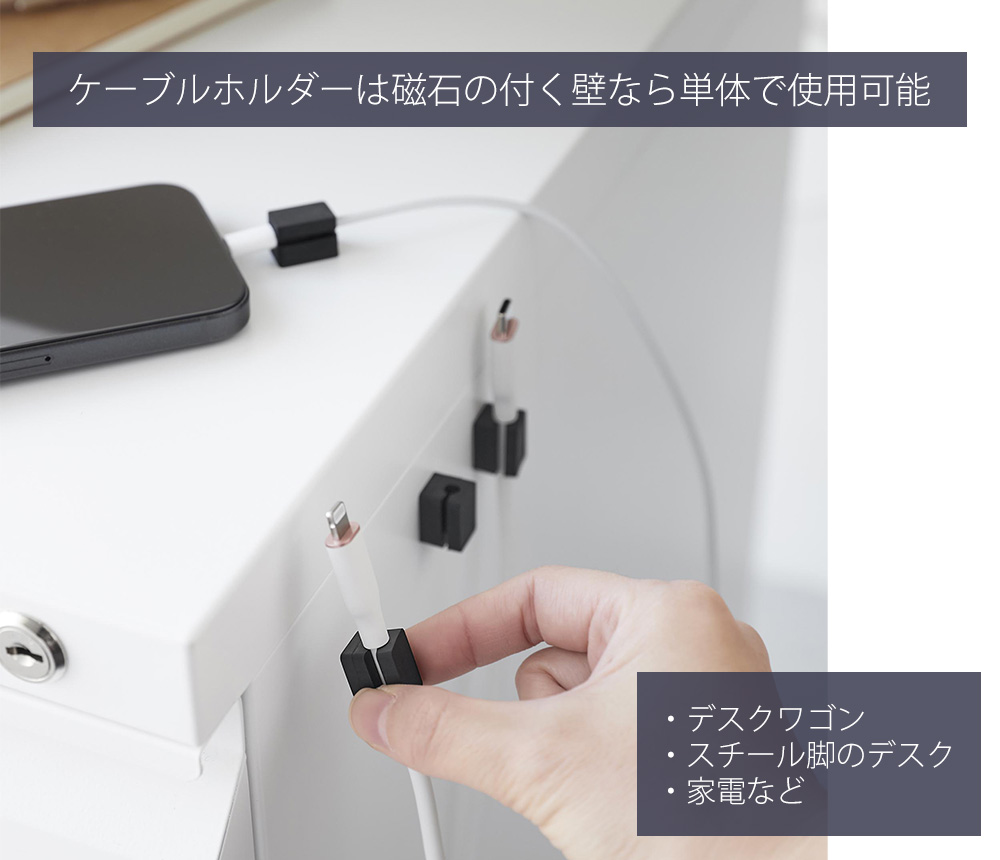 ケーブルホルダーは、デスクワゴンやスチール製のデスクの脚、家電などの磁石のつく壁なら単体でも使用ができます。