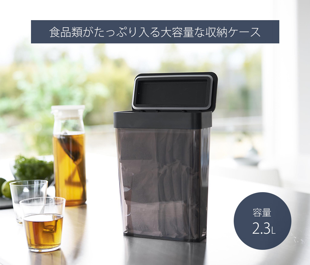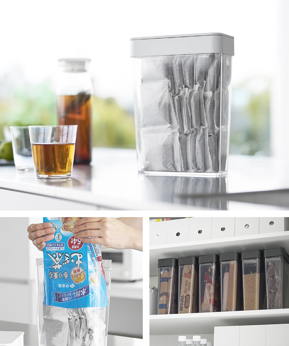 ティーバッグがたくさん入った大容量麦茶パックが1袋まるごと入る大容量収納ケース。シンプルなデザインのケースに入れ替えることで、キッチンをすっきりとした空間に変えることができます。