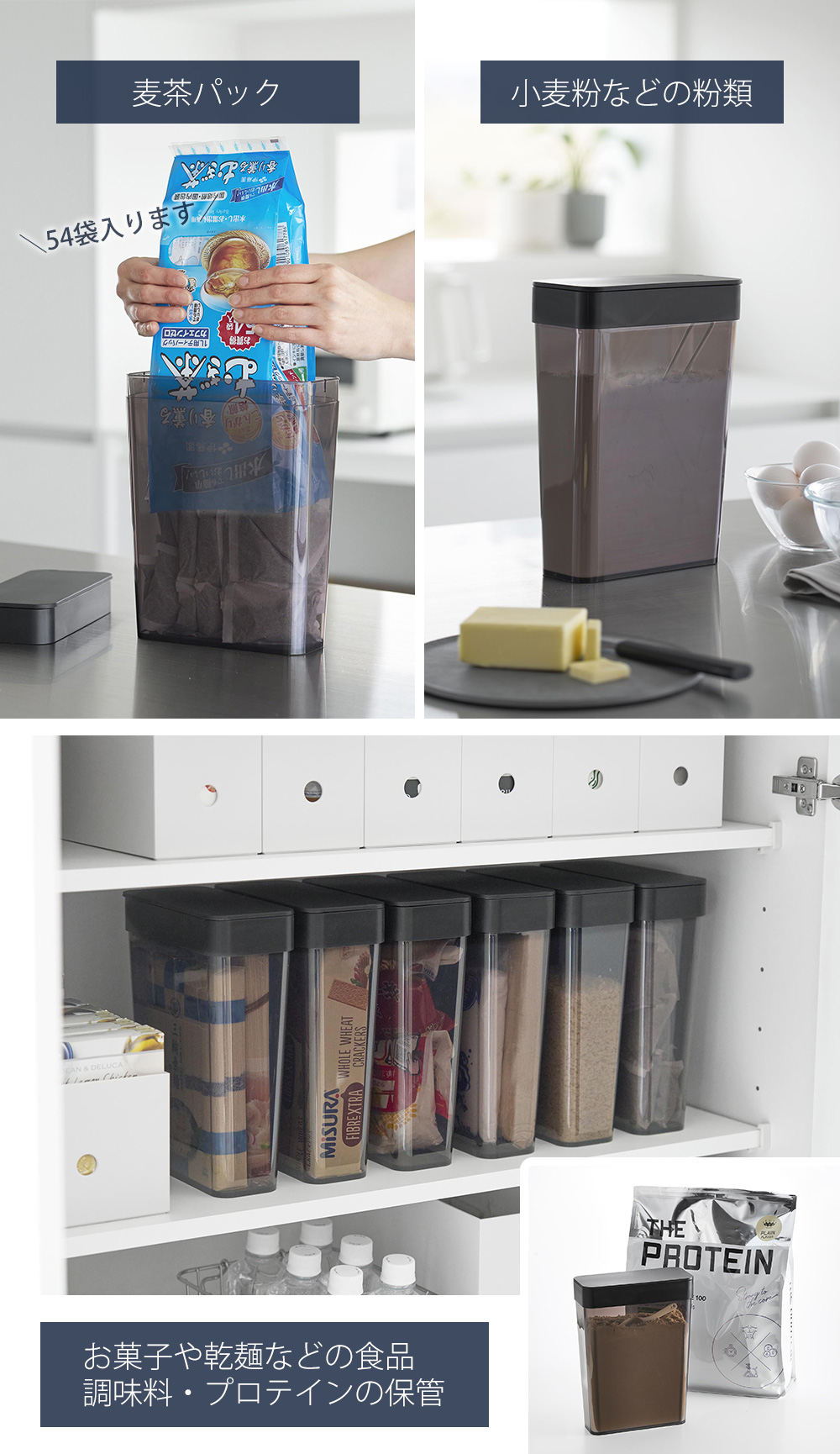 麦茶パックなら約54個収納可能。そのほかにも小麦粉などの粉物、調味料、お菓子類、乾麺などの食材・食品の保存にぴったりです。