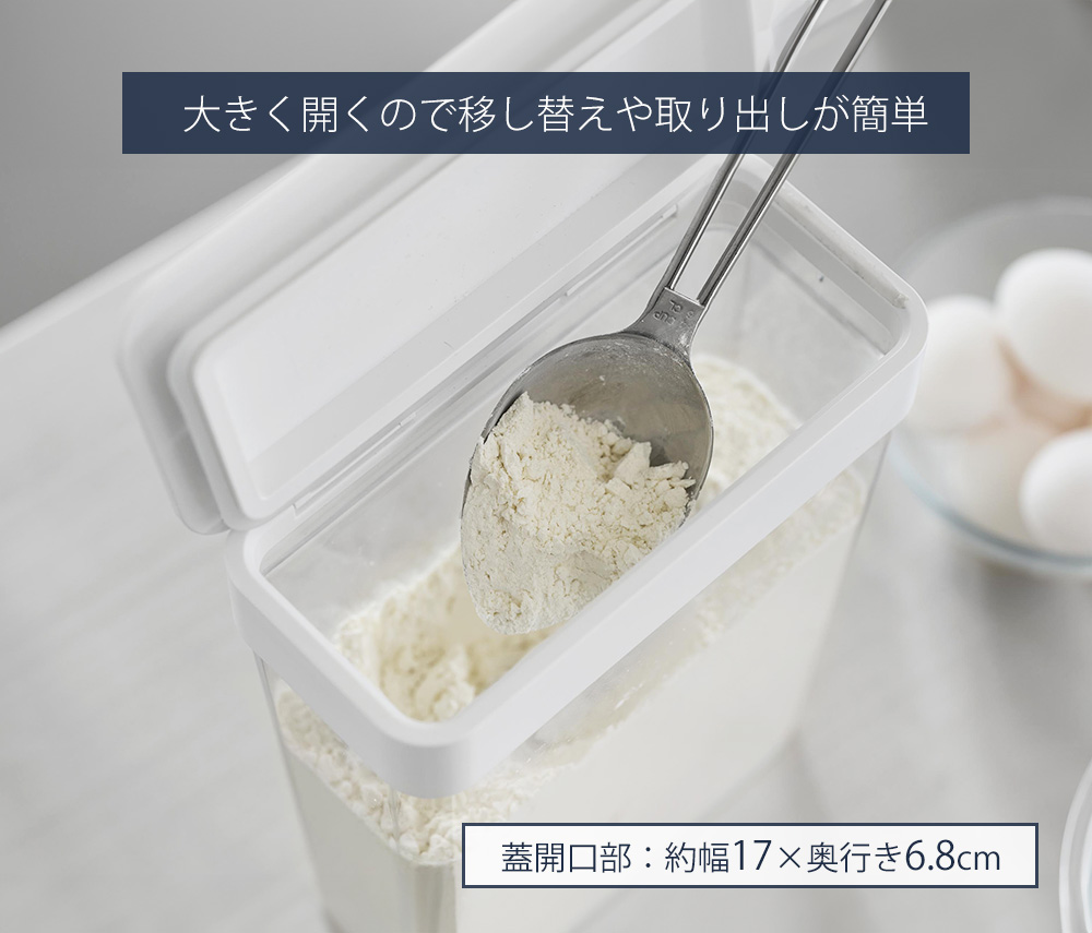 蓋の開口部は約幅17×奥行6.8cmあるので中に入れたものの取り出しが簡単。スプーンも出し入れもしやすいので、小麦粉などの粉類の移し替えもスムーズです。