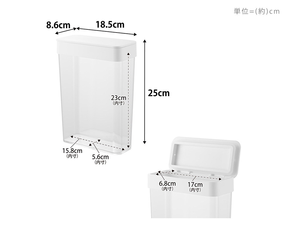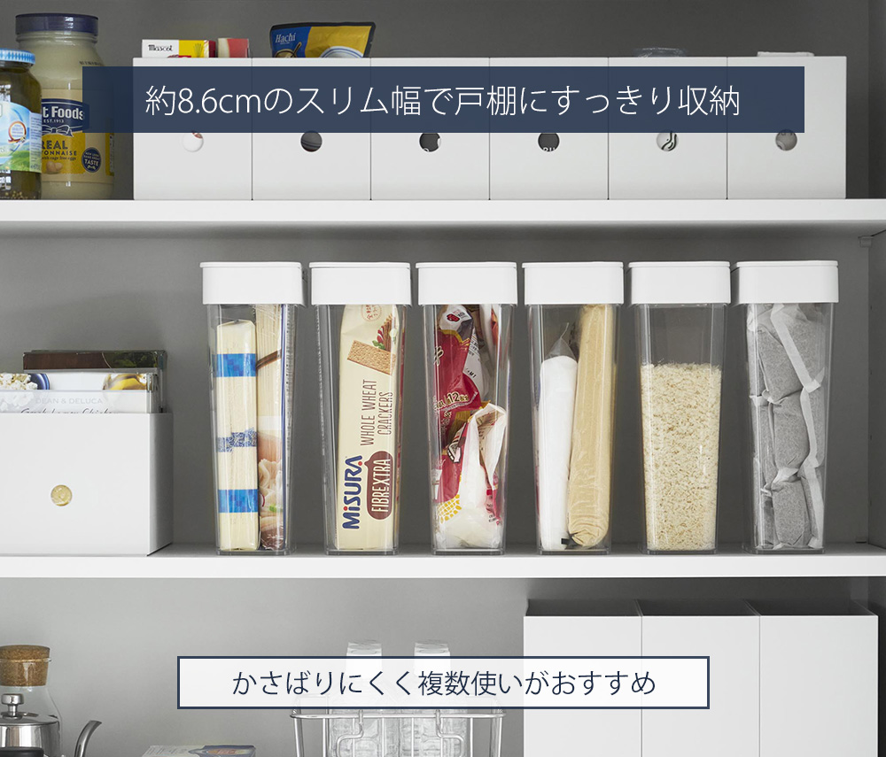幅が約8.6cmとスリムなので複数並べても圧迫感がなく、戸棚やキッチンカウンターなどにすっきりと収納できます。