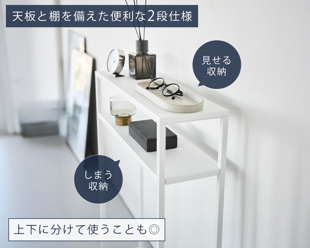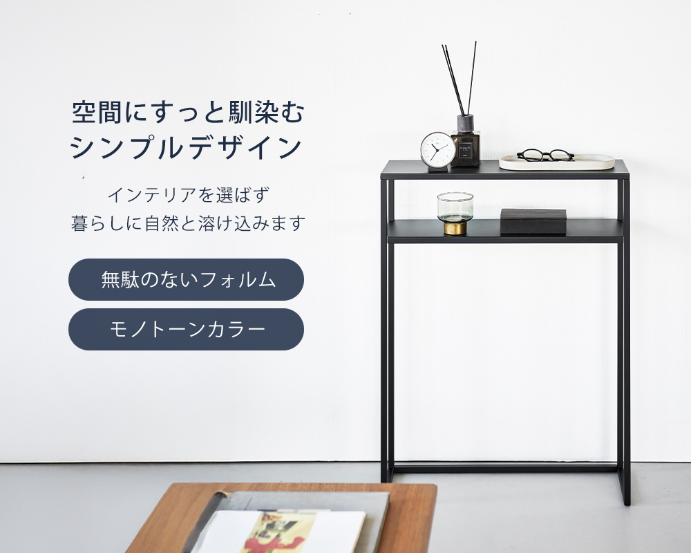 天板と棚を備えたシンプルな構造で、見た目と実用性を両立。上下に分けて使えるため、整理しながらすっきり使えます。