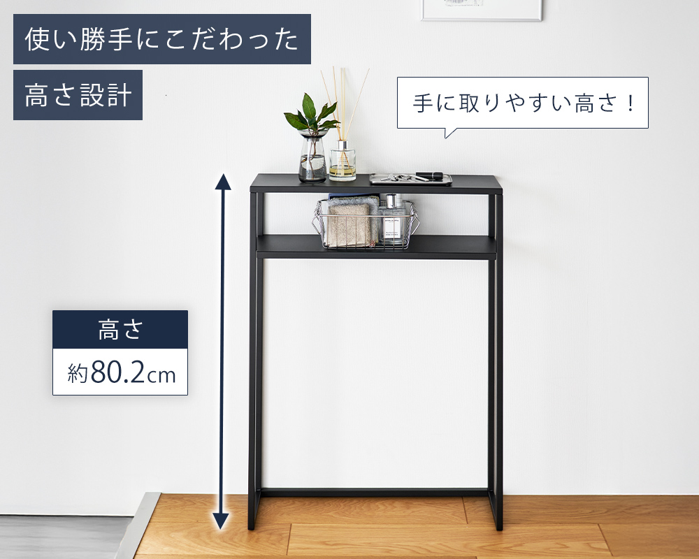 立ったままでも物が置きやすく、手に取りやすい高さ設計。玄関に置けば、鍵やハンコをサッと手に取れたり、ハンカチや消毒スプレーなどを使いやすい位置にスタンバイできます。