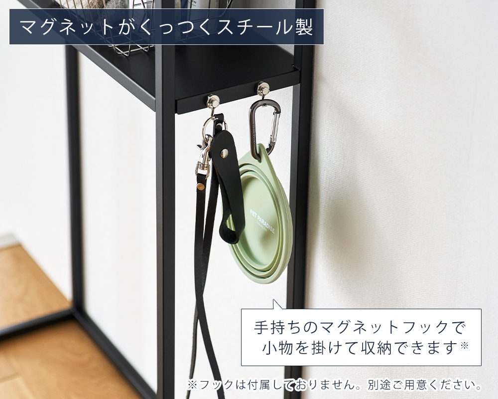 スチール製なのでマグネットが使用可能。お手持ちのマグネットフックを使えば、エコバッグやお散歩グッズなども引っ掛けて収納できます。