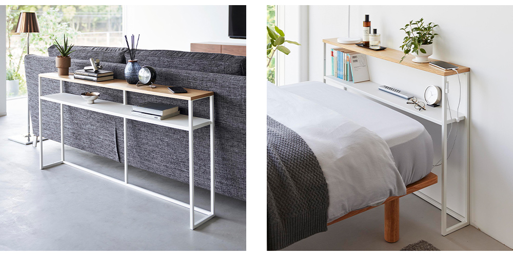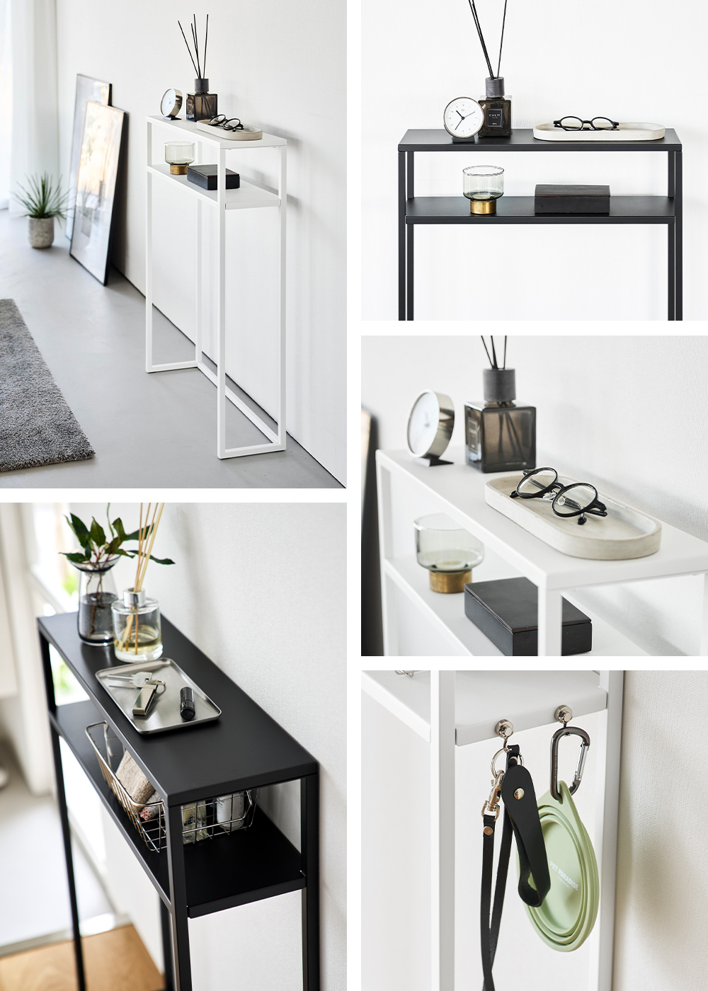 エントランスや廊下、リビングなど、さまざまな場所で活躍する棚付きコンソールテーブル。
