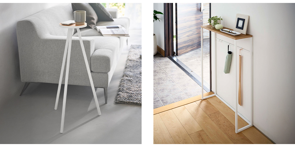 観葉植物やオブジェのディスプレイはもちろん、眼鏡や鍵など毎日使う小物の一時置きや定位置づくりにも便利。かごを使えば細々した物もまとめて収納でき、暮らしに合わせて柔軟に使えます。