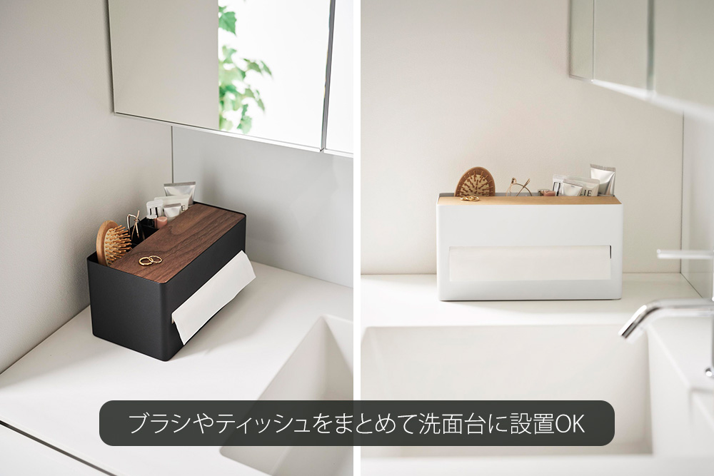 洗面台に設置して、ブラシやチューブ類とティッシュをまとめて収納しても便利です。