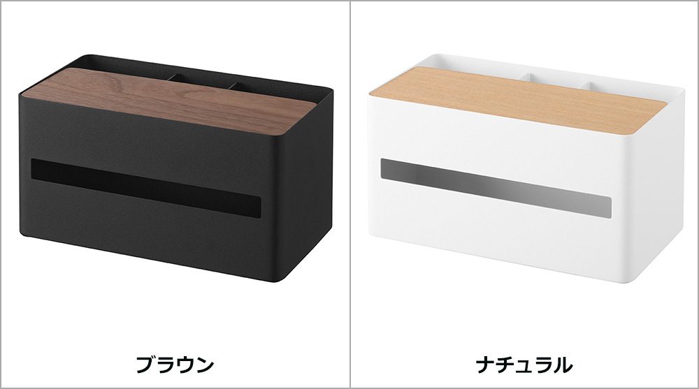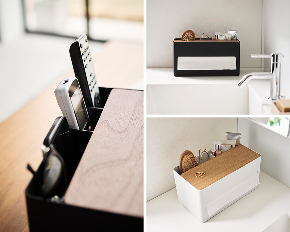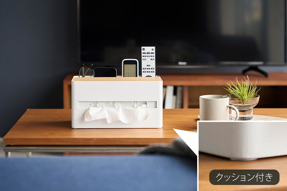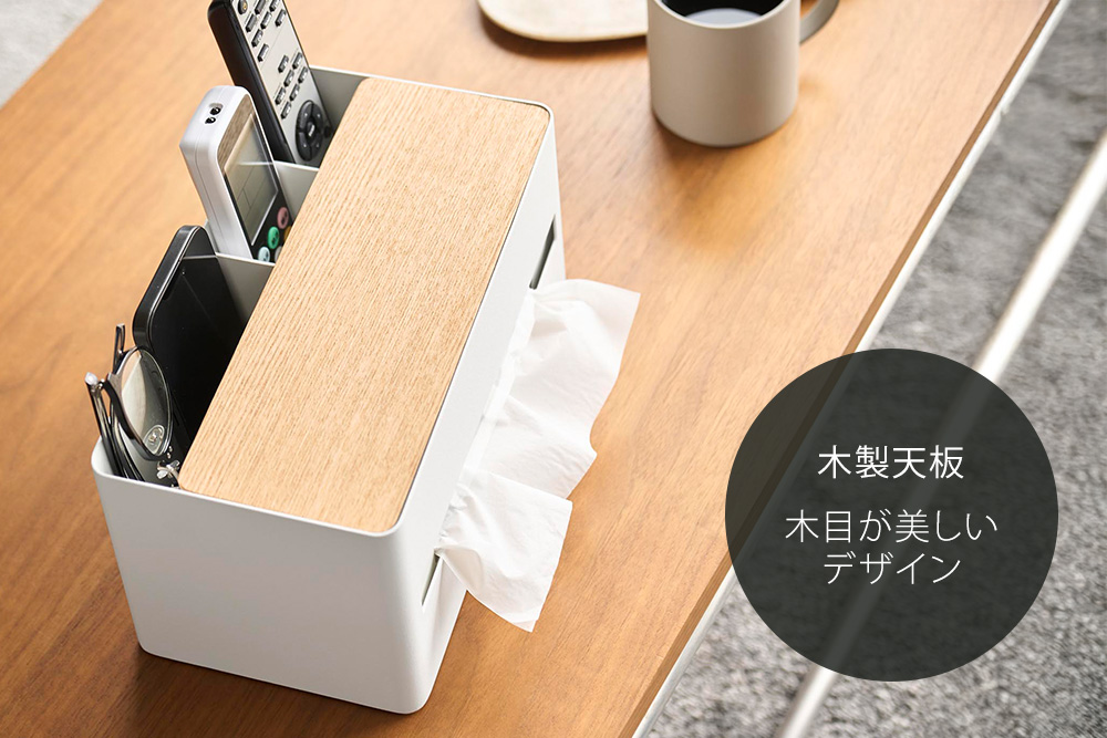 散らかりがちなリモコンや文具などの小物と、ティッシュボックスをまとめてスッキリと収納できます。