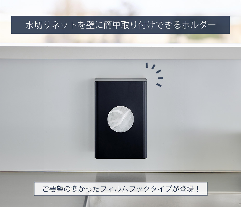 人気の水切りネットホルダーから、ご要望の多かったフィルムフック取付タイプが登場!水切りネットをシンク近くにすっきり収納できます。