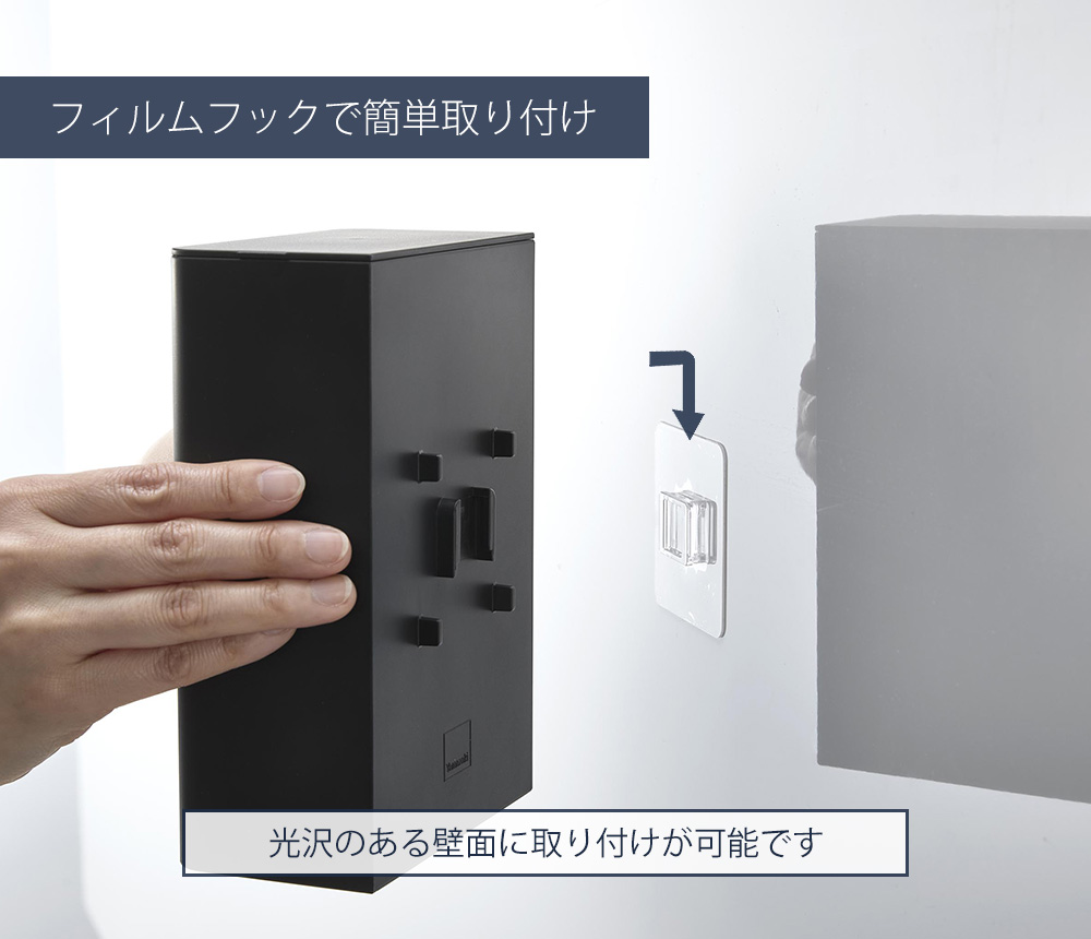 ホルダーの設置は平らな壁面にフィルムフックを水平に取り付け、本体をフック部分に差し込むだけととても簡単です。
