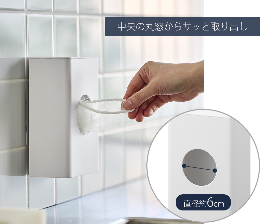 ホルダーの中央にあいている直径約6cmの丸窓から、水切りネットを取り出す仕様です。