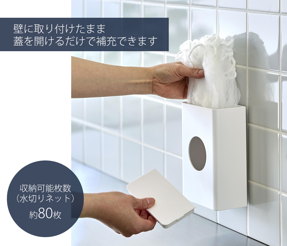 壁に取り付けたまま蓋を開けることができるので、補充も簡単。浅型の水切りネットが約80枚収納可能です。※水切りネットの素材や形状・サイズによっては80枚入らない場合もございます。