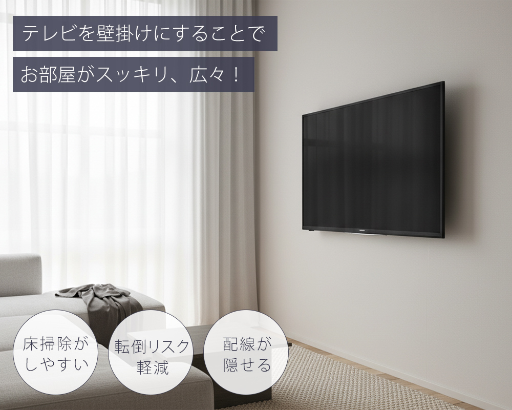 テレビを壁に掛けることで床置きによる圧迫感をなくし、空間をすっきりと演出。固定式タイプのため、テレビを壁に近づけて設置でき、見た目もスマートにまとまります。床まわりが片付き、掃除もしやすく。