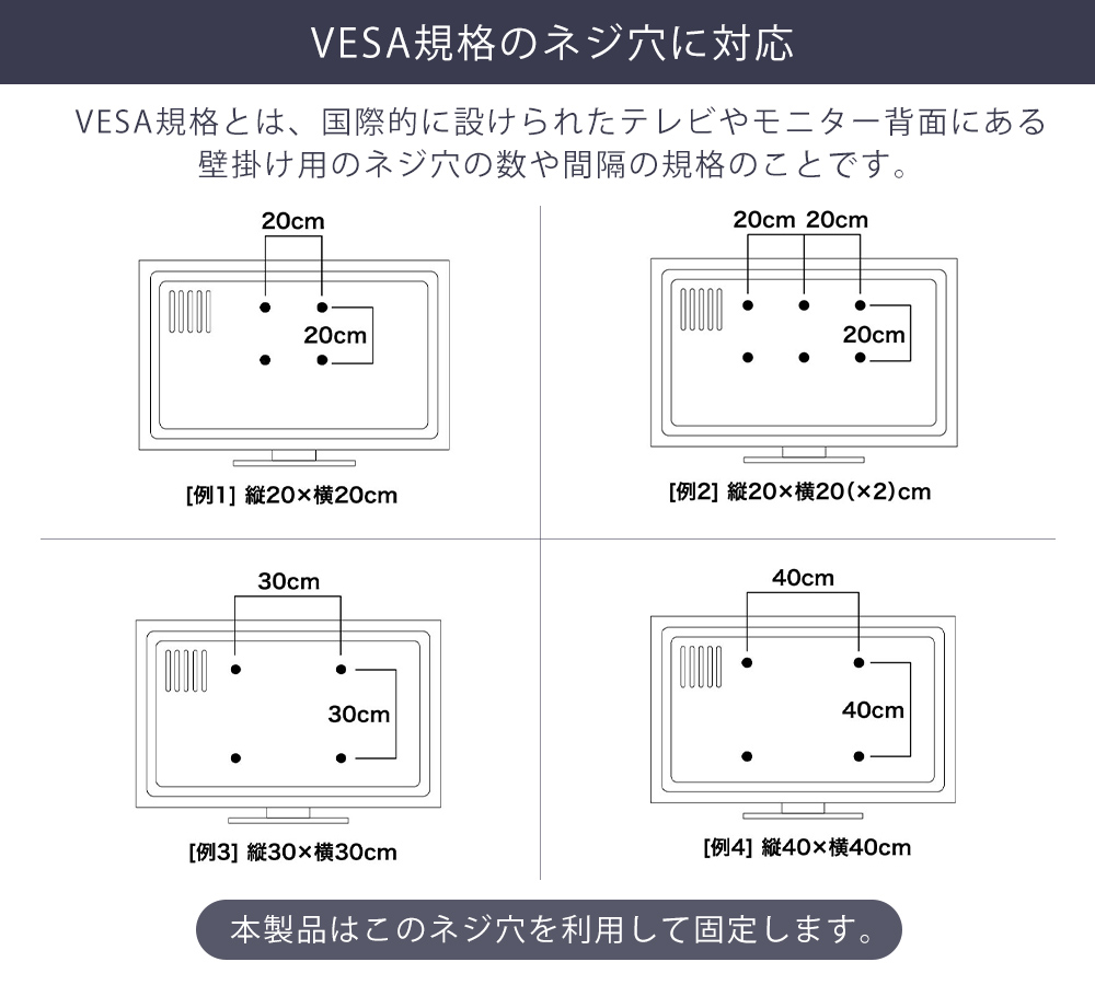 ●テレビ背面のVESA規格ネジ穴ピッチが縦横とも20・30・40cmのいずれか