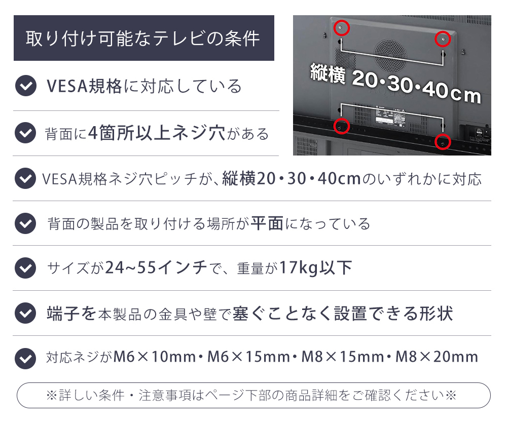 ●テレビ背面(裏側)に、4か所以上のVESA規格ネジ穴があること