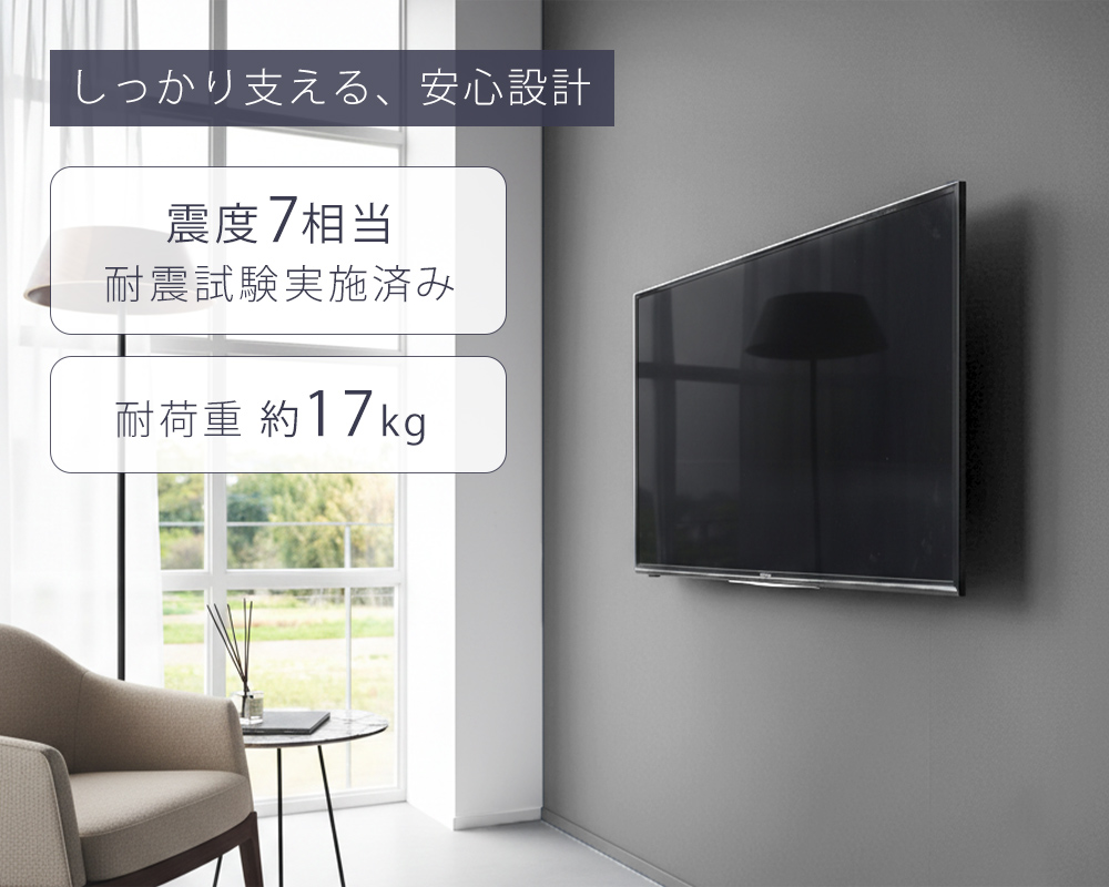 耐荷重17kgの設計で、震度7相当の耐震試験を実施しています。しっかり固定でき、日常使いでも安心です。