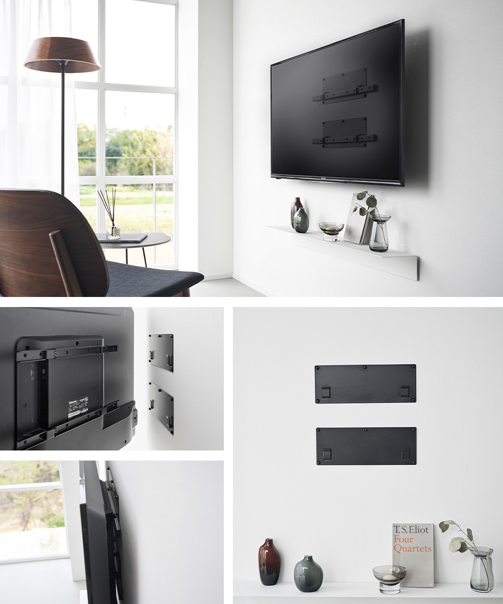 壁に2個のプレートを取り付け、テレビ背面に固定したバーを掛けるだけ。複雑な調整が少なく、取り付け手順が分かりやすい設計です。