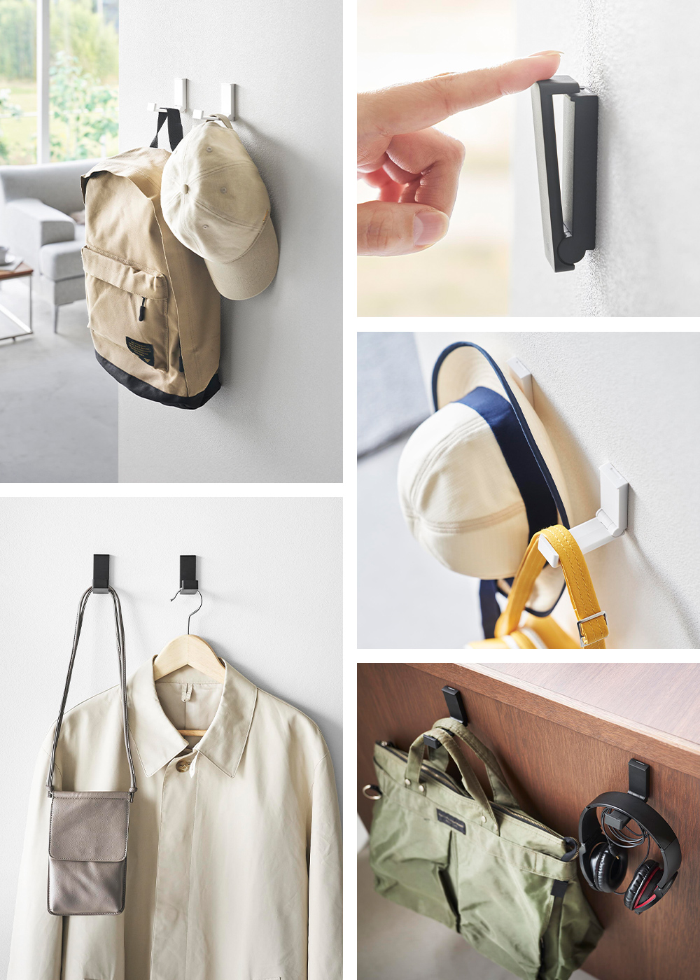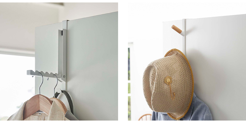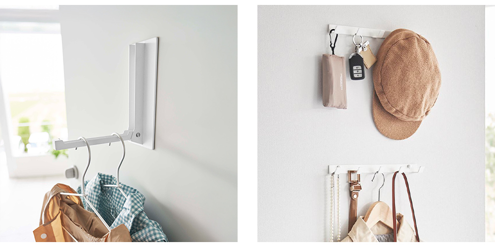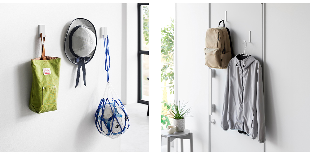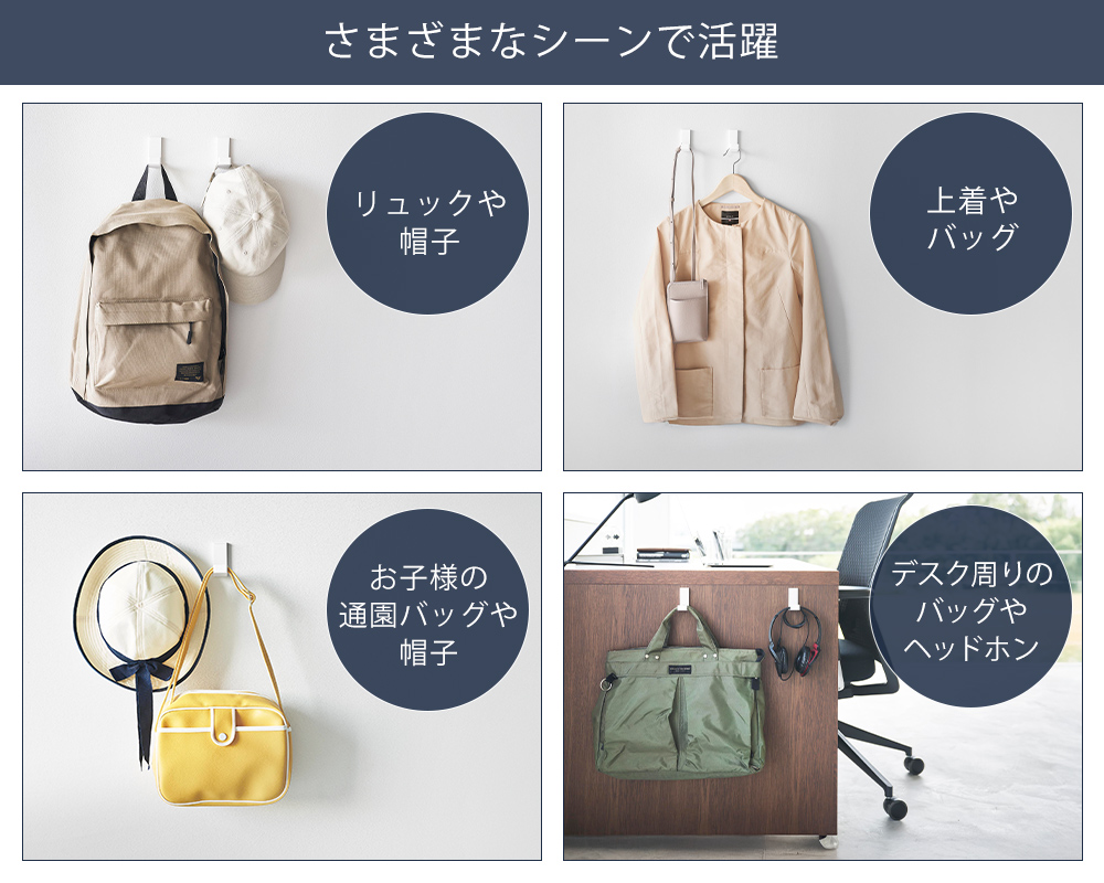 玄関ではリュックや帽子、室内では上着やバッグの一時掛けに。デスク周りのヘッドホン収納や、お子さまの通園バッグの定位置づくりにも便利。さまざまな場所で活躍します。