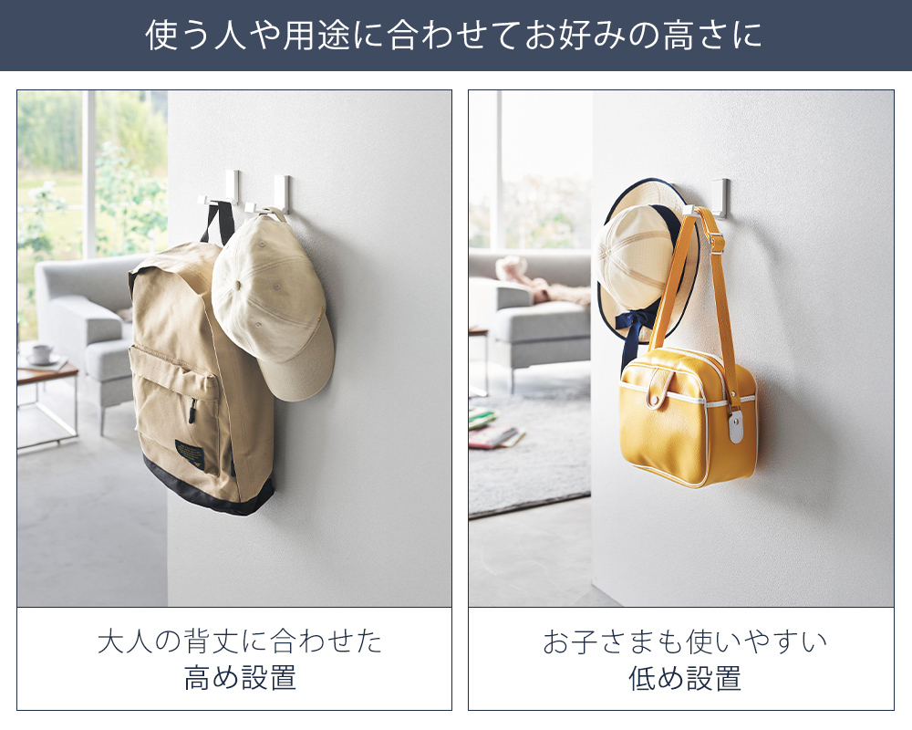 使う人や用途に合わせて、取り付ける高さを自由に調整できます。大人用の上着やバッグは高めに、お子さま用のバッグは低めに設置するなど、暮らしに合わせて使えます。
