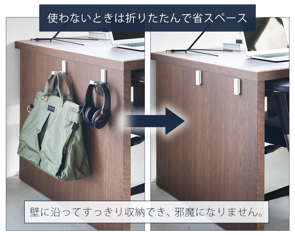 フック部分は折りたたみ式。使用しない時は壁に沿ってコンパクトに収まり、通路や家具まわりでも邪魔になりません。必要な時だけサッと使える設計です。