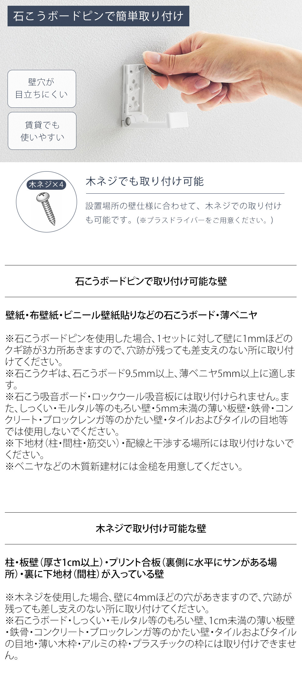 付属の石こうボードピンをコインなどで押し込むだけで固定できます。壁穴が目立ちにくいピン仕様なので、賃貸でも取り入れやすく、好きな場所に設置可能。木ネジでの取り付けにも対応しています。
