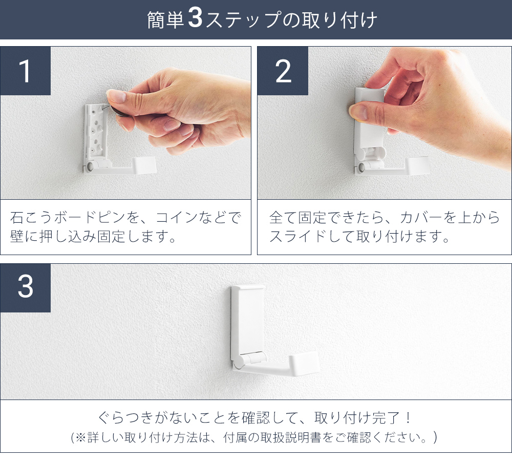 石こうボードピンで固定し、カバーをスライドして装着するだけ。特別な工具を使わず設置できるので、初めてでもスムーズに取り付けできます。詳しい方法は付属の説明書をご確認ください。