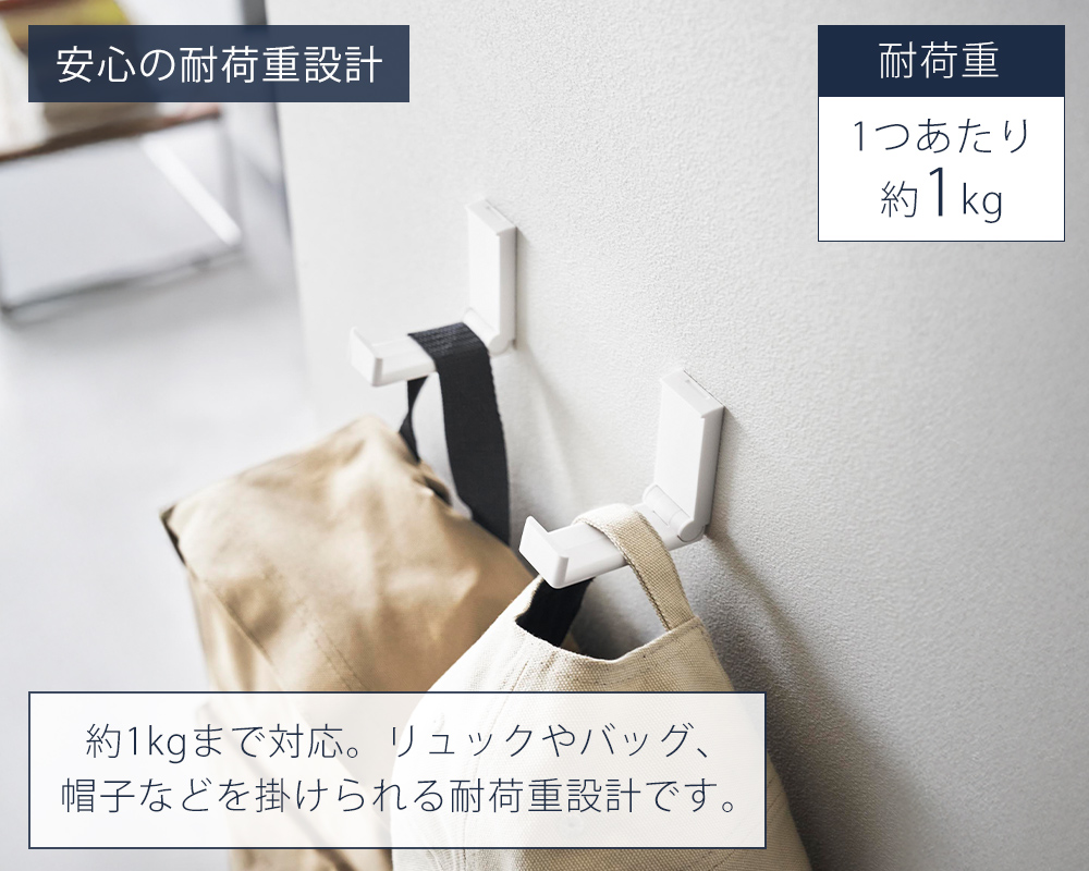 1つあたり約1kgまで対応。リュックやバッグ、帽子などの収納にちょうどいい耐荷重設計です。日常的に使うアイテムの定位置づくりに役立ちます。