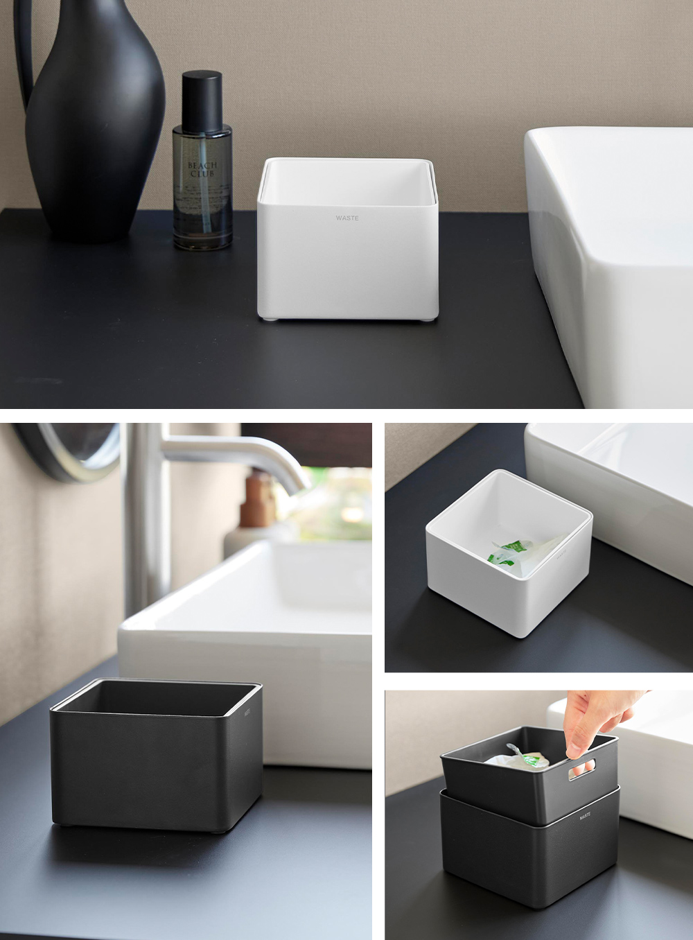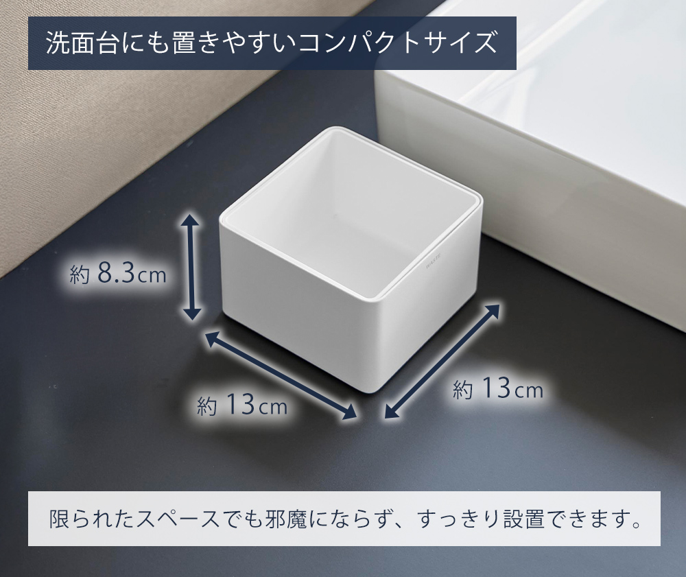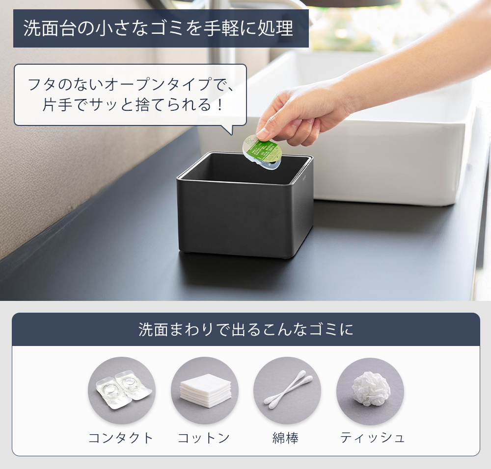 フタのないオープン形状で、クレンジング後やコンタクト交換後のゴミもそのまま手軽に処理。洗面台まわりでのちょっとしたゴミ捨てに便利です。