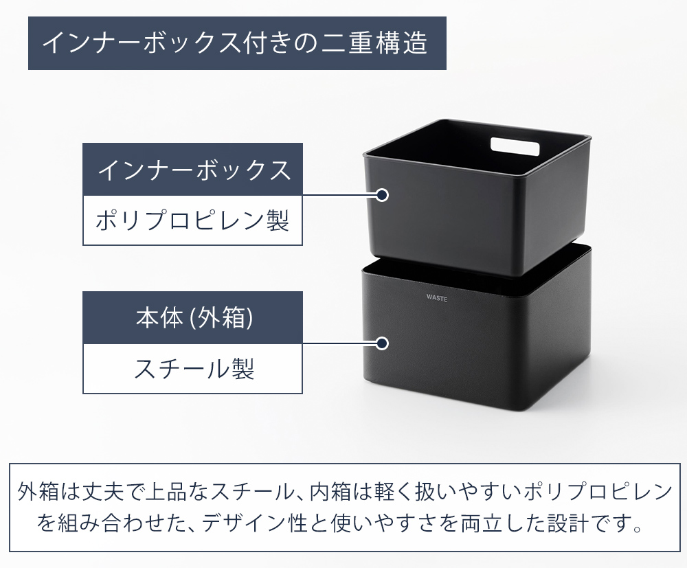 外箱(本体)は見た目がキレイで丈夫なスチール製、インナーボックスは軽く扱いやすいポリプロピレン製。素材それぞれの特長を活かした、使い勝手のよい二重構造になっています。