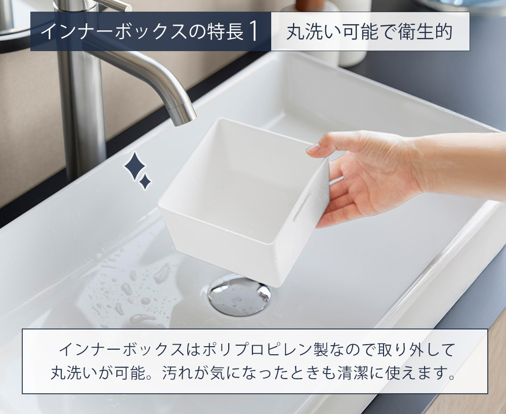インナーボックスはポリプロピレン製で汚れが気になったときは丸洗いできるので、いつでも清潔な状態で使えます。