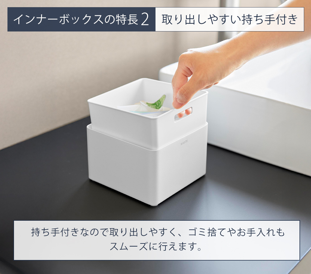 持ち手付きのインナーボックスで、ゴミ捨てやお手入れの際もスムーズ。簡単に持ち上げて取り出せます。