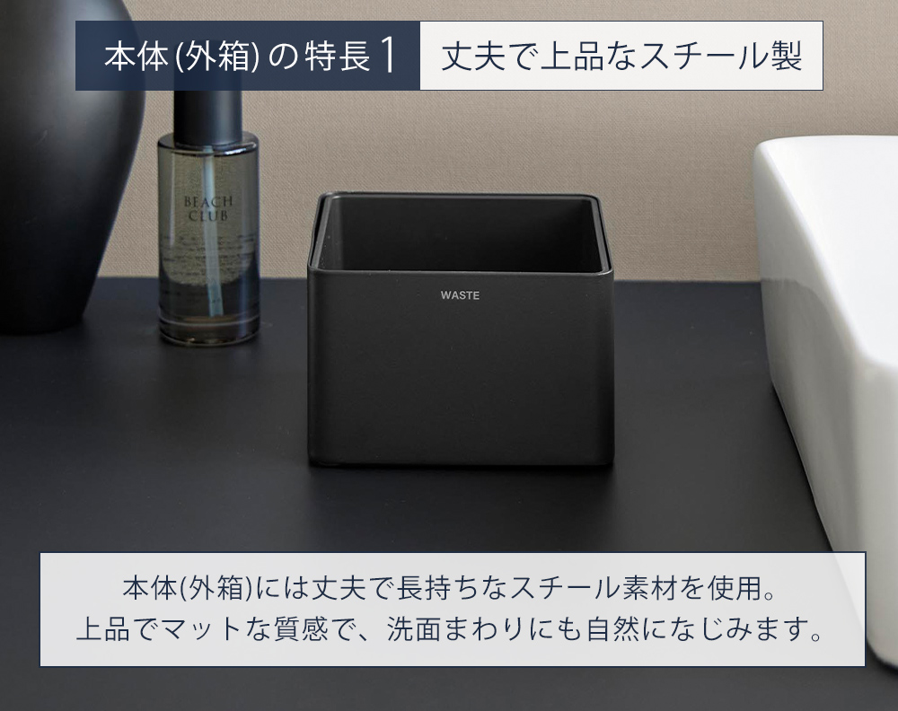 本体外側には耐久性に優れたスチール素材を採用。マットな質感で落ち着いた印象を与え、洗面台まわりの空間にも自然になじみます。