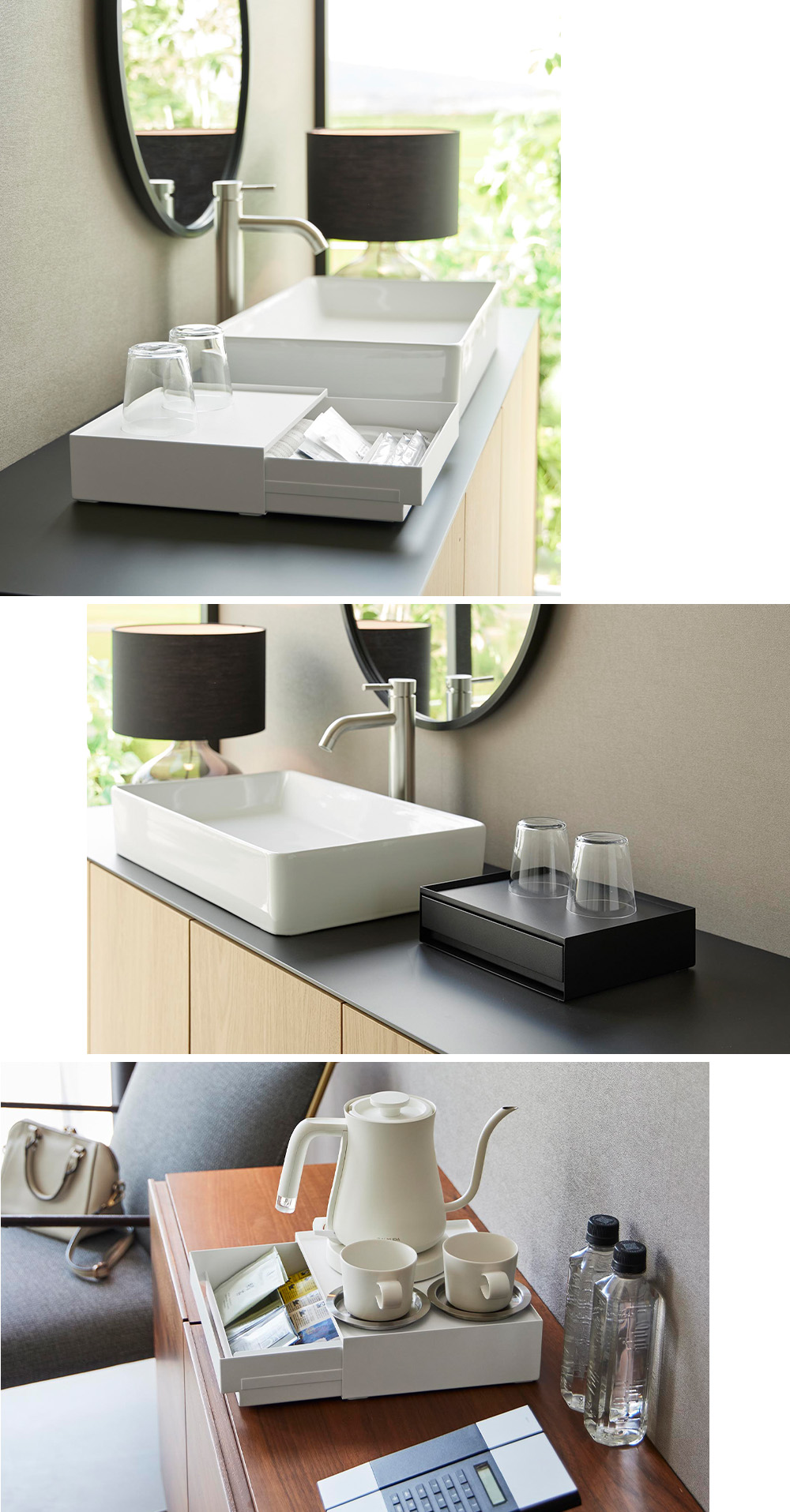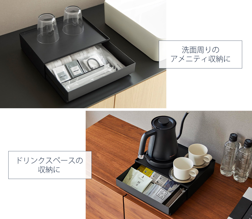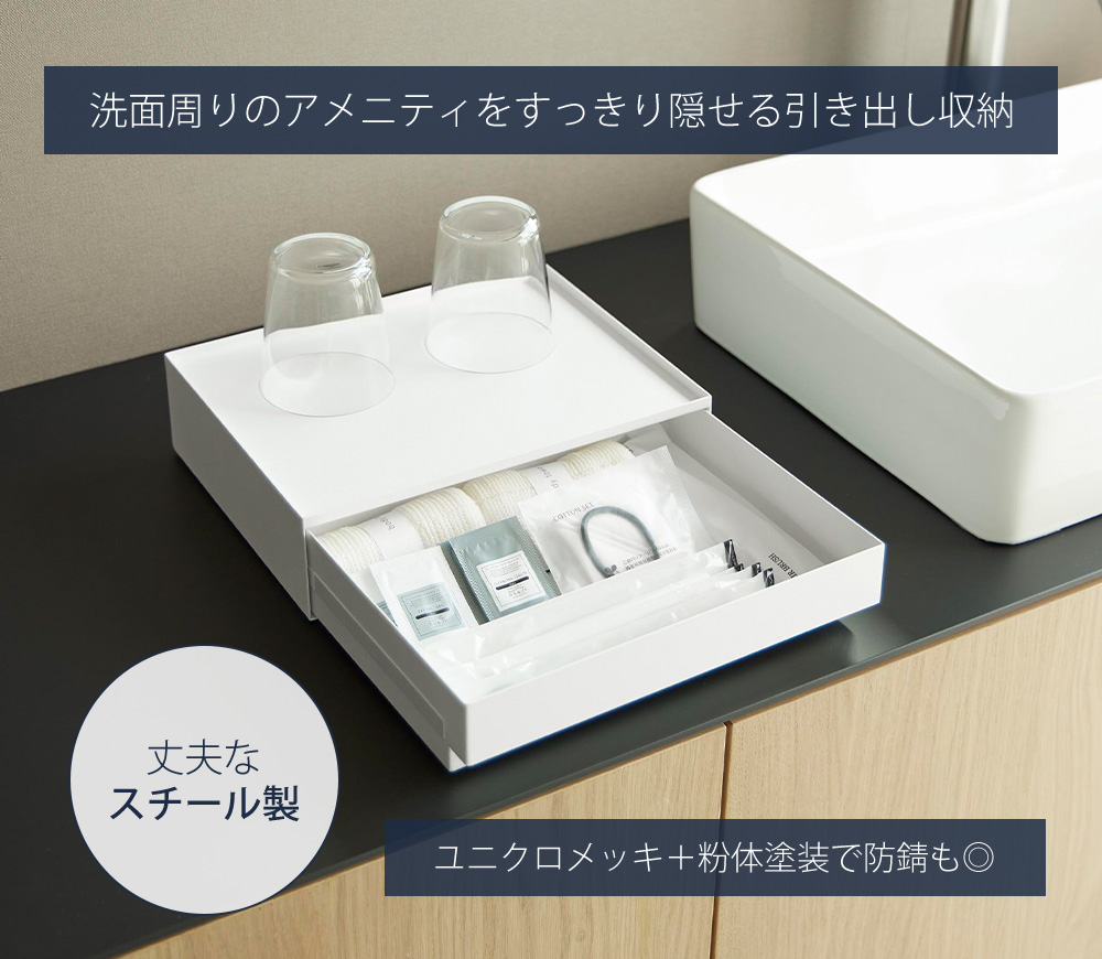 細々としたアメニティ類をまとめてすっきり収納できる引き出し収納です。丈夫で高級感のあるスチール製で上質な空間に仕上げます。さらにユニクロメッキ+粉体塗装で錆びにくく、長くご使用いただけます。