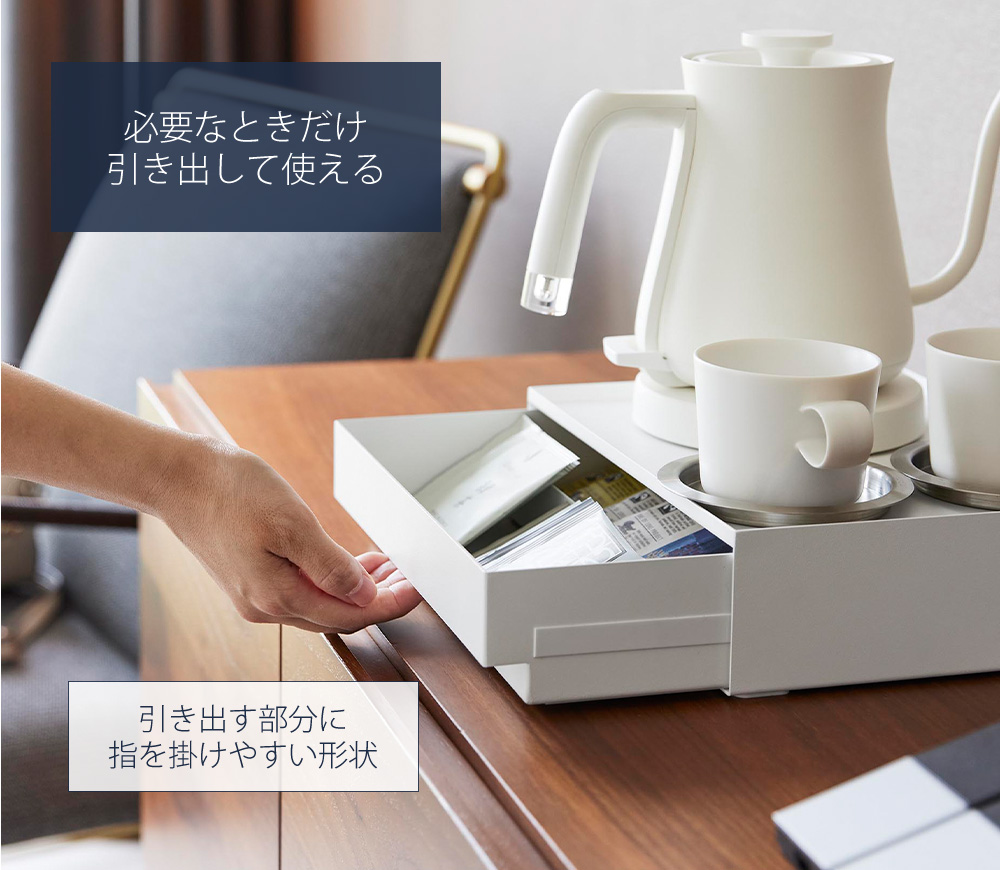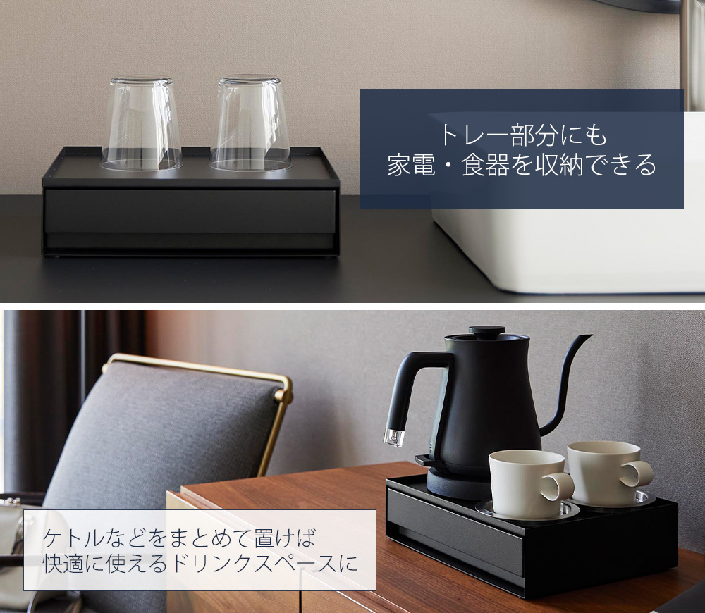 上部のトレーにはケトルなどの家電や食器類を置くことができます。ケトル・マグカップ・ティーバッグなど、一緒に使う物をまとめて置いておけるので、快適なドリンクスペースに。
