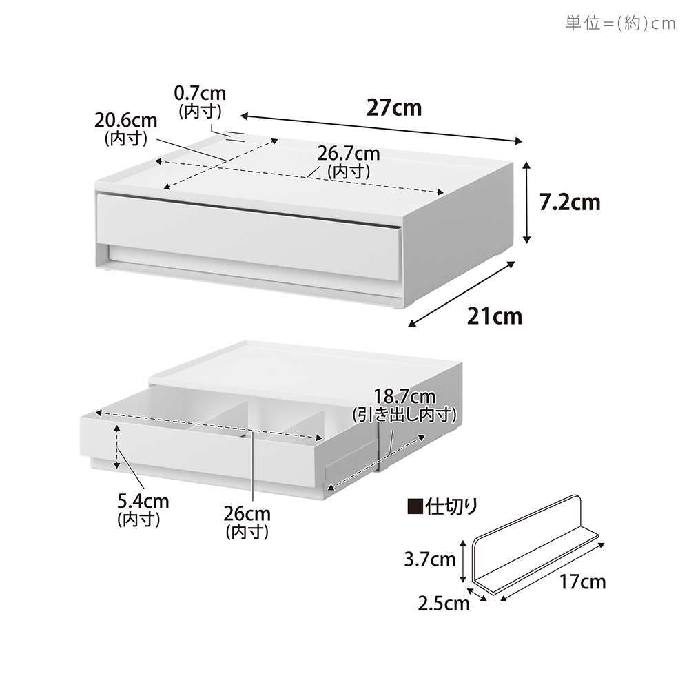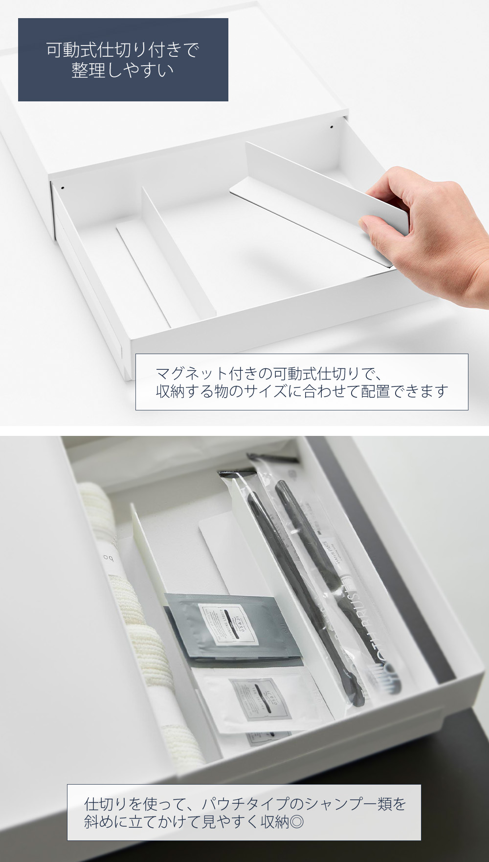 マグネットが付いた可動式仕切りが2個付いており、引き出しの中を使いやすく整理できます。収納する物の大きさに合わせて配置できる、使い勝手の良いデザインです。