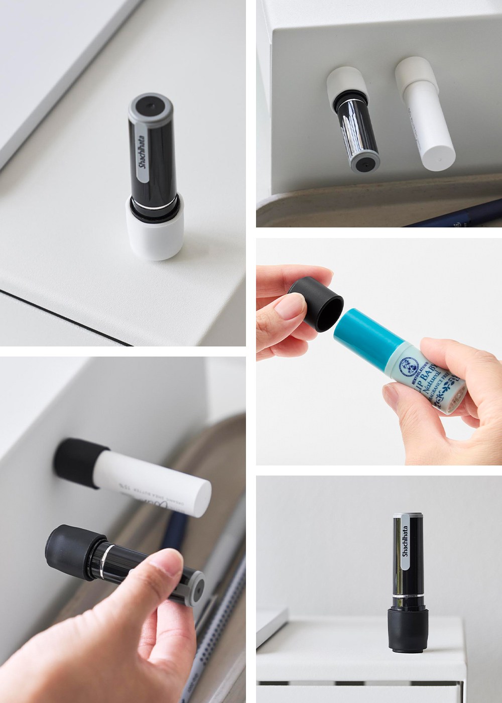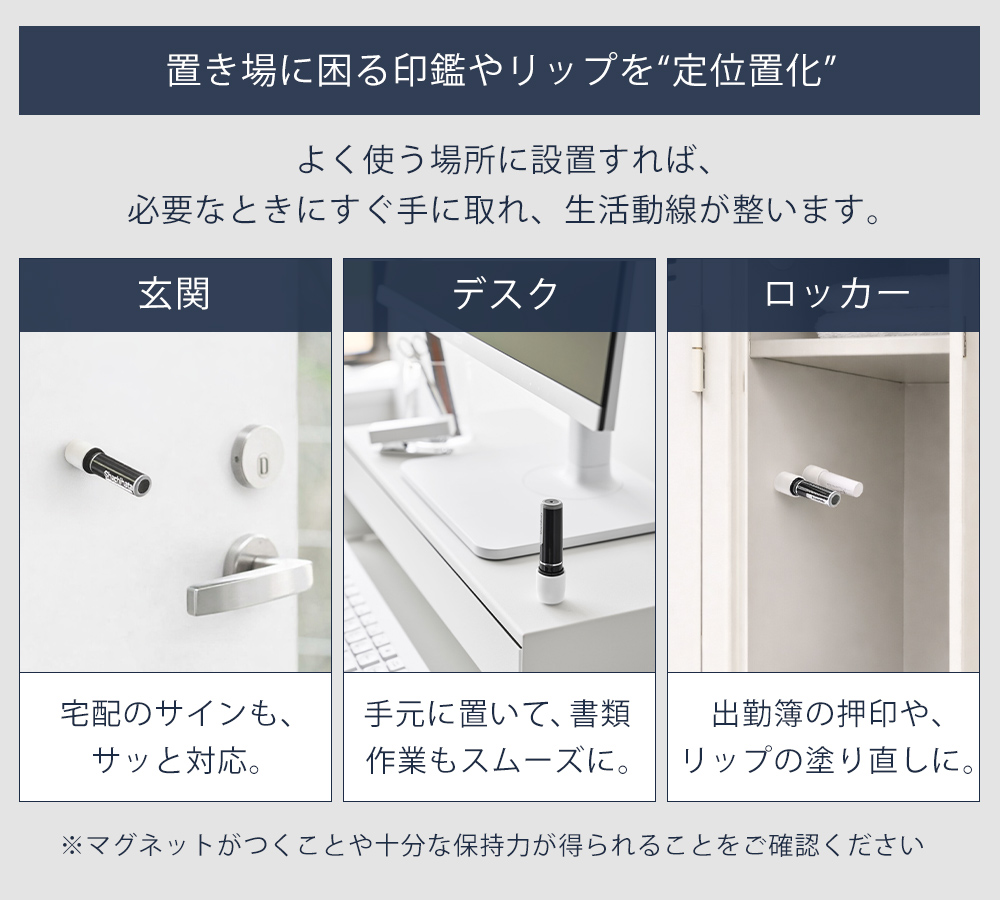 玄関やデスク、ロッカーなど、印鑑やリップを使う場所にあらかじめ設置しておけば、必要なときにすぐ手に取れます。置き場所に迷わず、日々の動作がよりスムーズに整います。