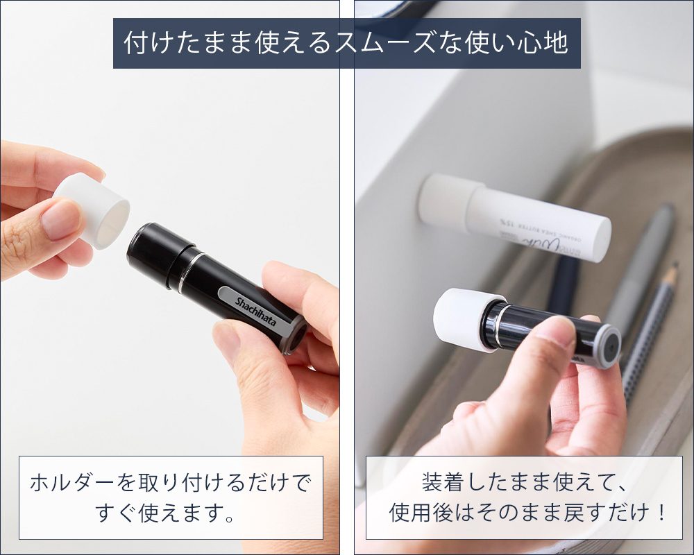 印鑑やリップにホルダーをはめるだけで準備完了。使うたびに付け外しする必要がなく、使用後もそのまま戻せるため、手間なく快適に使えます。