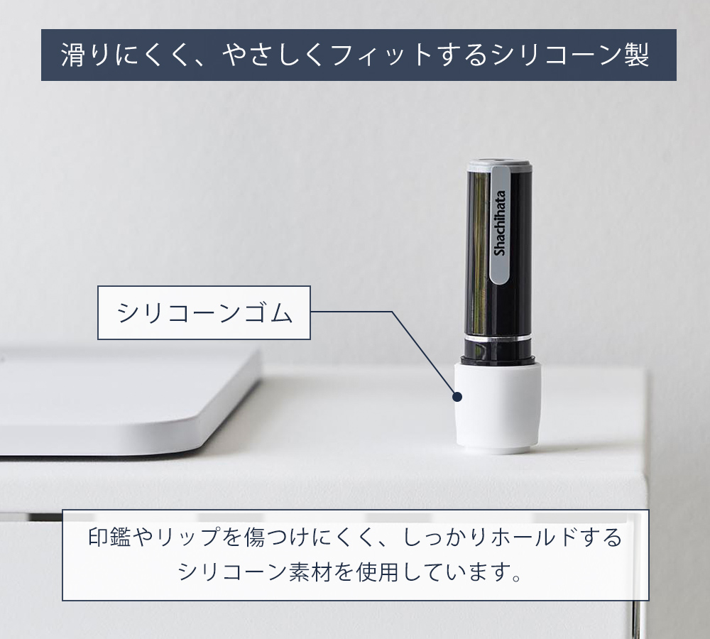 ホルダー部分には柔らかいシリコーンを使用。印鑑やリップを傷つけにくく、滑りにくい設計でしっかりホールドします。安心して日常使いできる素材です。