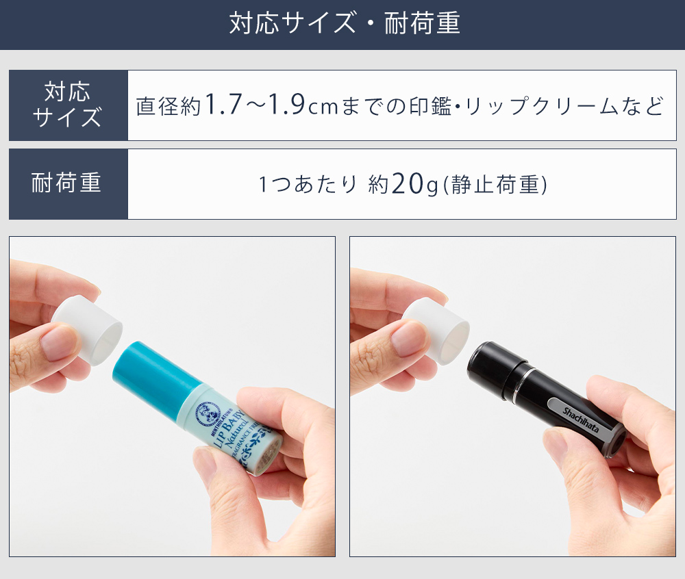 直径約1.7〜1.9cmまでの印鑑やリップクリームに対応。耐荷重は1つあたり約20g(静止荷重)です。ご使用前にお手持ちのサイズ・重量をご確認ください。