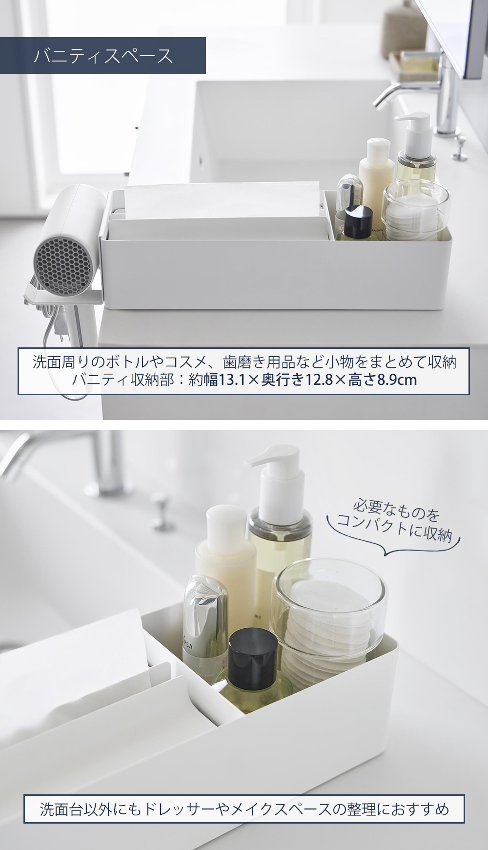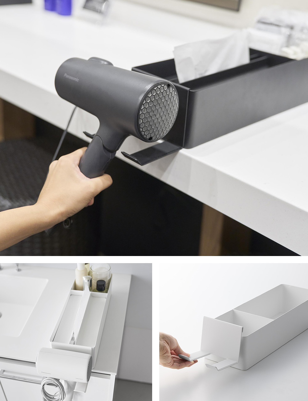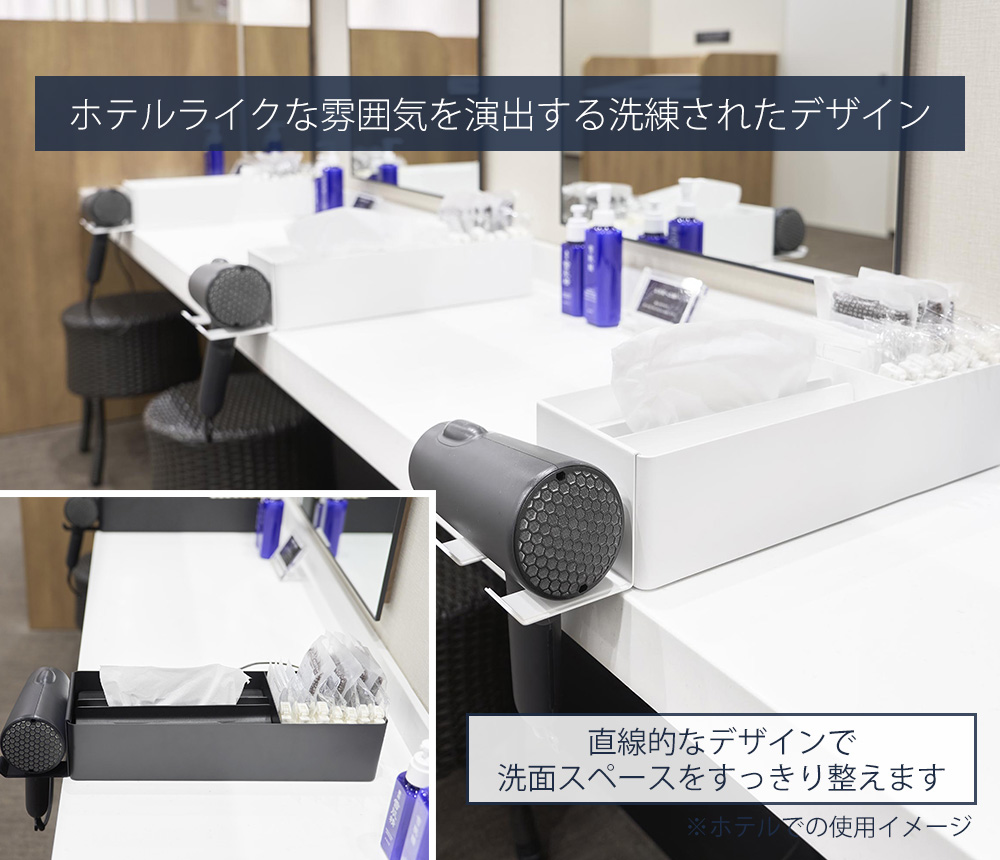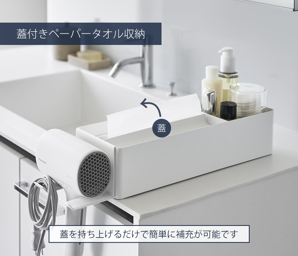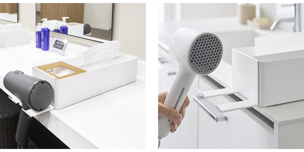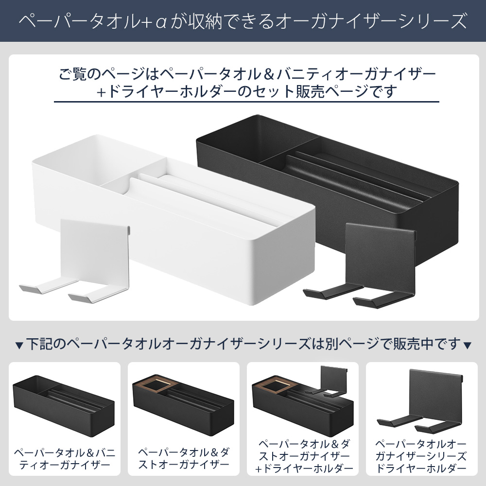 ペーパータオルケースに収納スペースがついたオーガナイザーシリーズが登場です。洗面小物を収納できるバニティスペース付き。オーガナイザーのフチに引っ掛けられる専用のドライヤーホルダーとセットでお届けします。