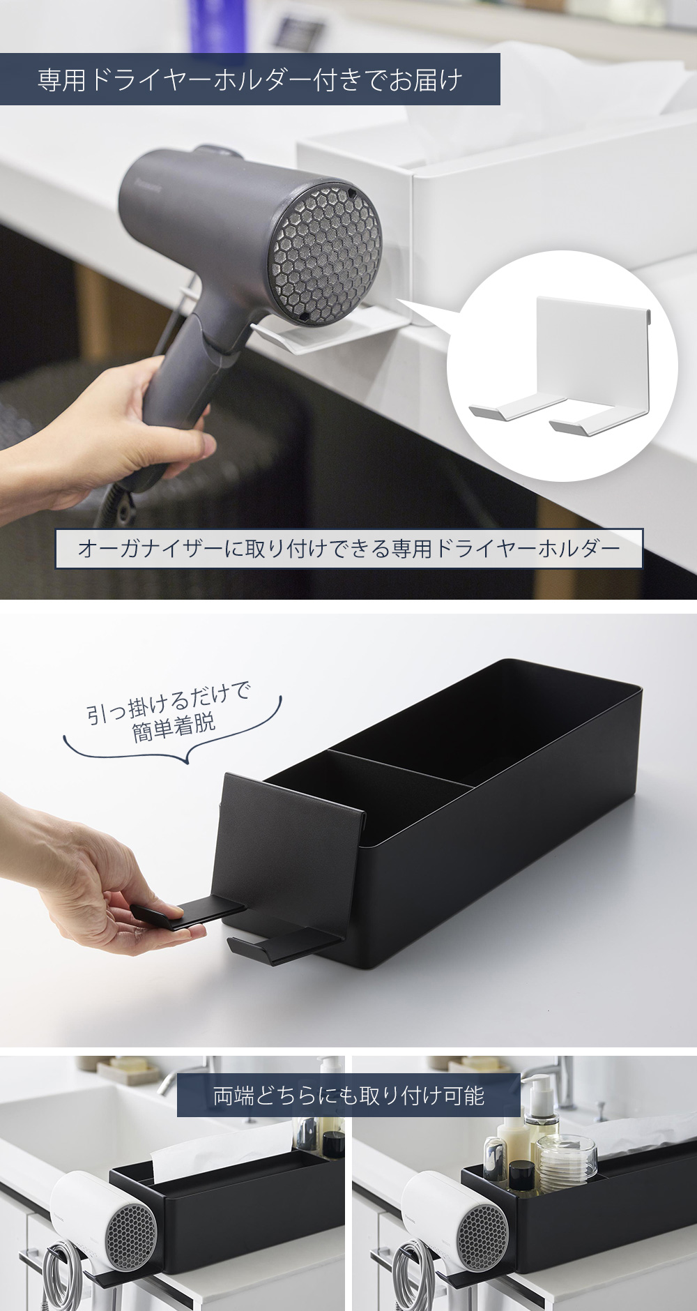 別売りオプションのオーガナイザーに取り付けできる専用ドライヤーホルダーをご用意。セットでご購入いただけます。オーガナイザーの両端どちらにも取り付けが可能です。