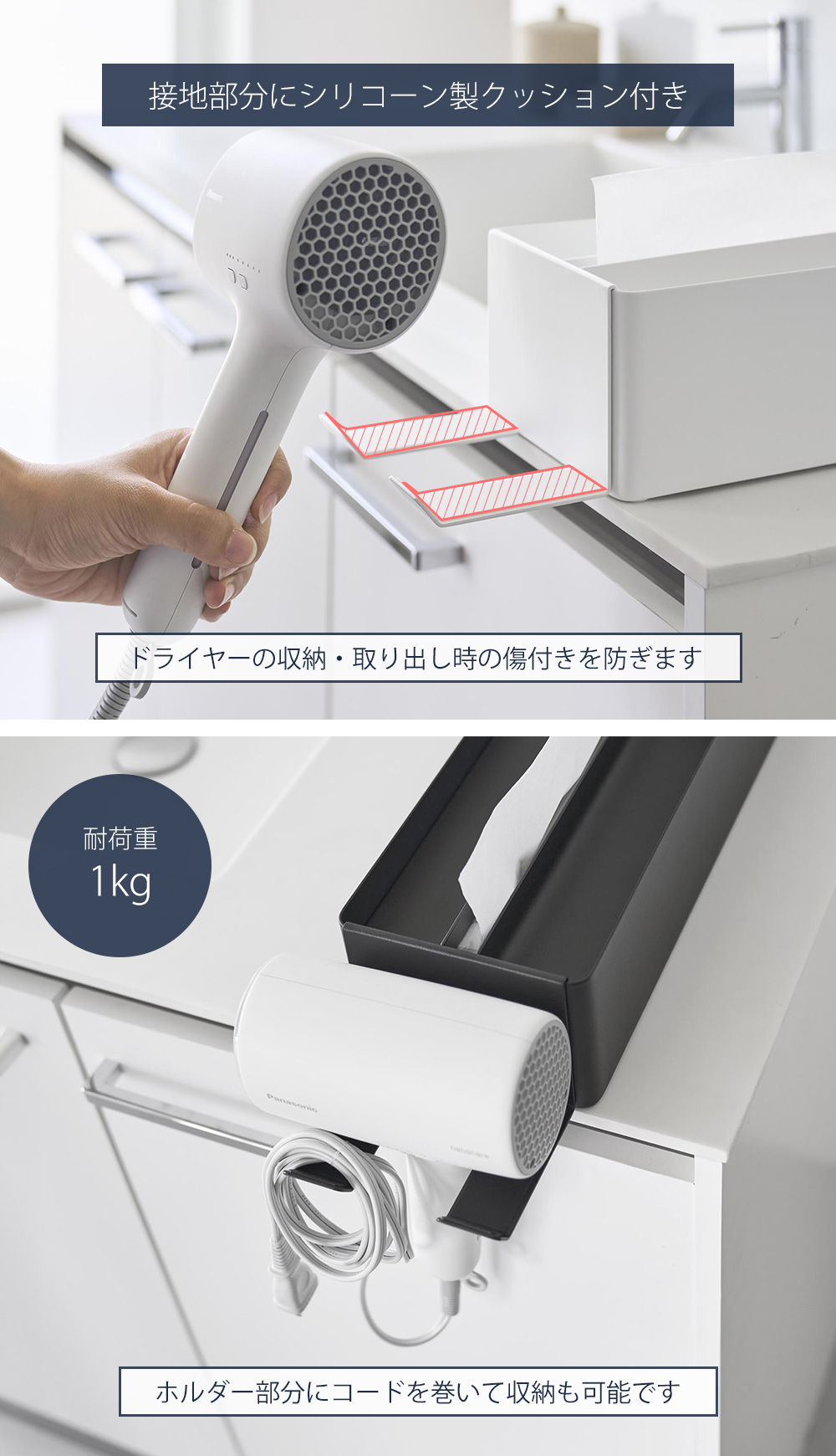 ドライヤー設置部分にはシリコーン製のクッション付きで、収納・出し入れ時のドライヤーへの傷つきを防ぎます。耐荷重は1kgあり、ホルダー部分にはコードを巻いてすっきりと収納も可能です。