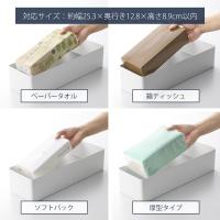 幅25.3×奥行12.8×高さ8.9cm以内の一般的なティッシュボックス・ペーパータオルなどに対応しています。箱ティッシュ、ソフトパック、厚型など色々な種類に対応しています。