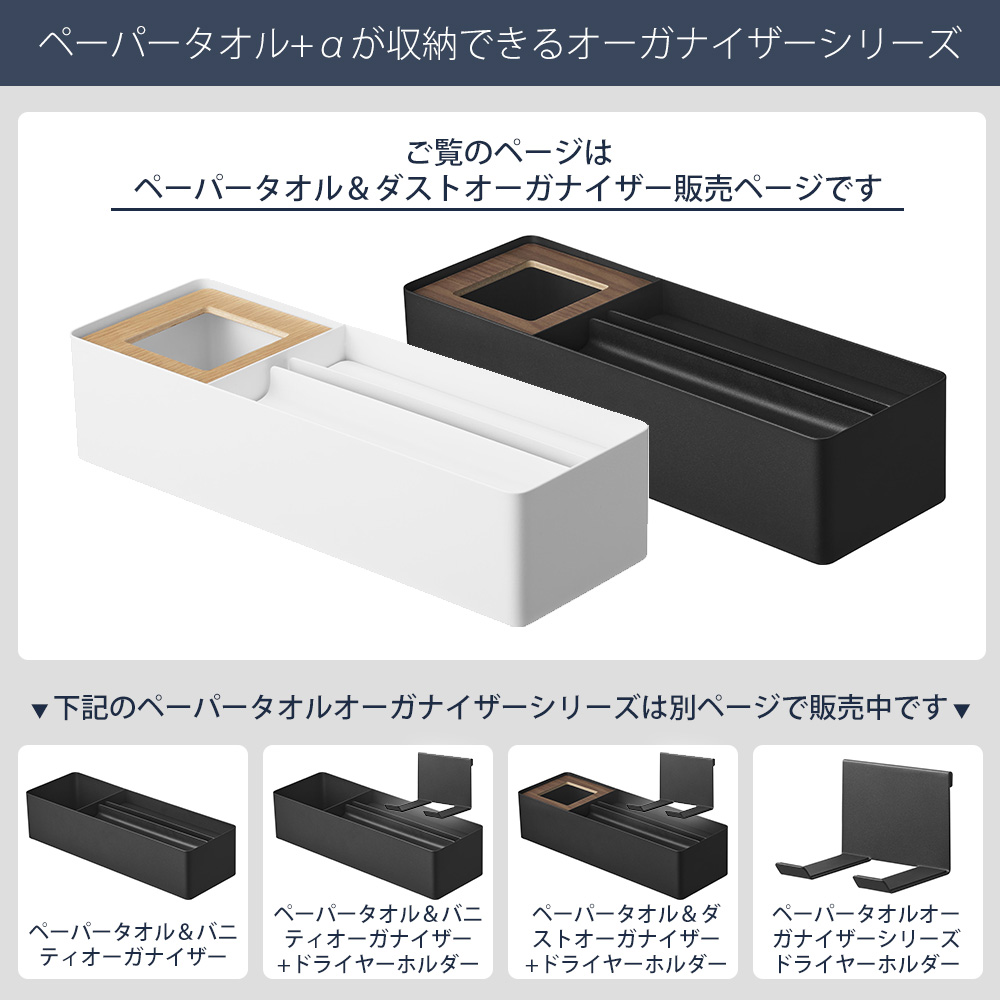 ペーパータオルケースに収納スペースがついたオーガナイザーシリーズが登場です。パッとごみが捨てられるダストボックス付きです。
