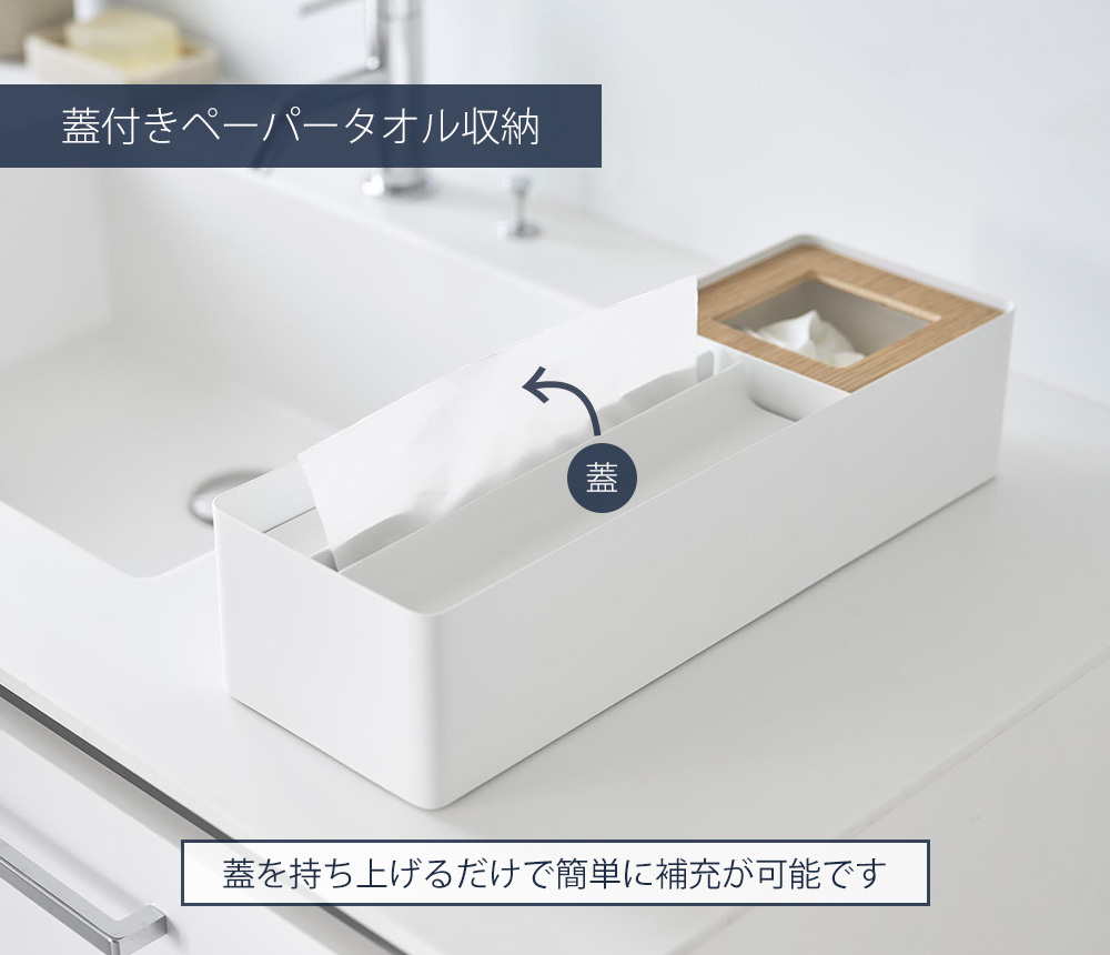 ペーパータオル収納部分は蓋付き。蓋を持ち上げるだけで簡単に補充が可能です。ホコリやゴミの侵入も防ぎます。