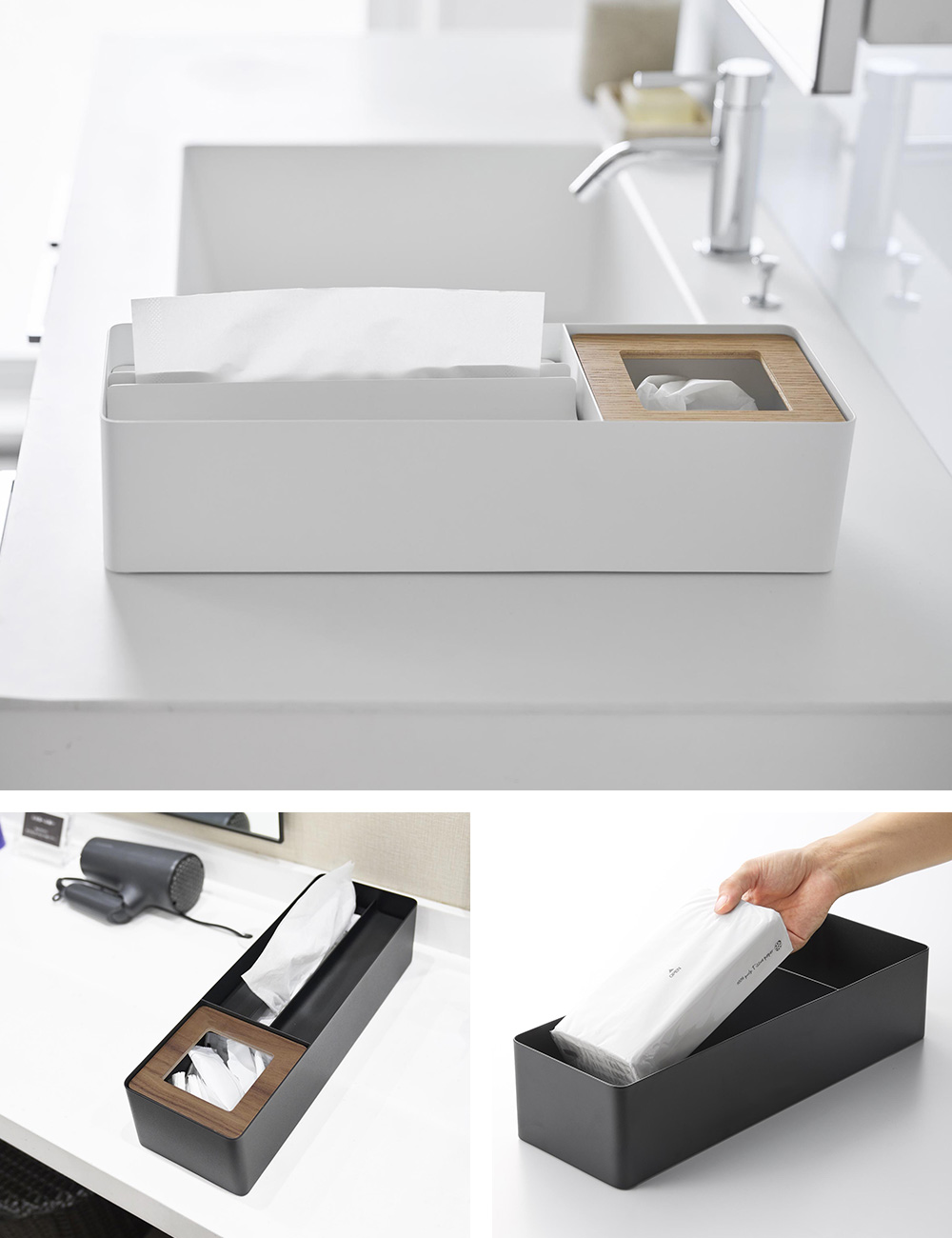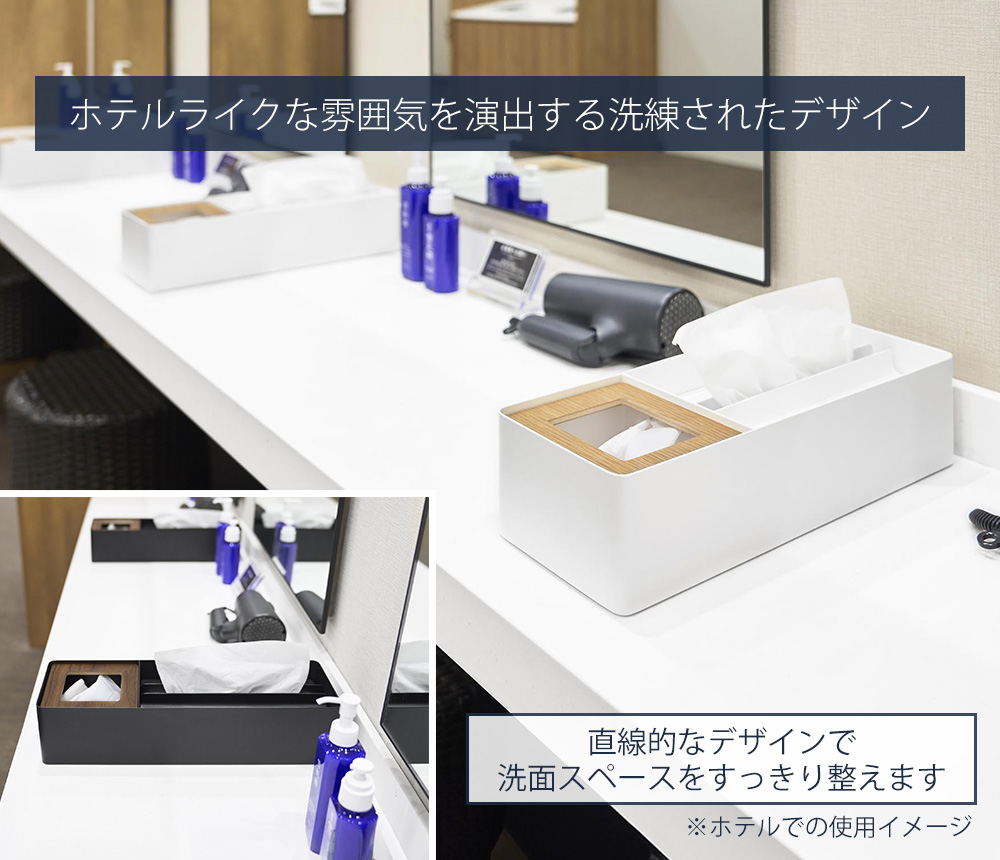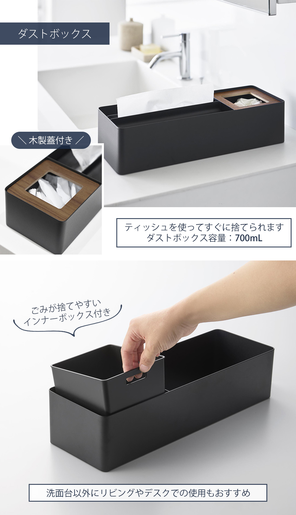 ペーパータオル&ダストオーガナイザーは容量700mlのゴミ箱付き。ティッシュを使ってパッと捨てることができます。インナーボックス付きでごみが捨てやすいのもポイント。洗面台以外にリビングやデスクでの使用もおすすめです。